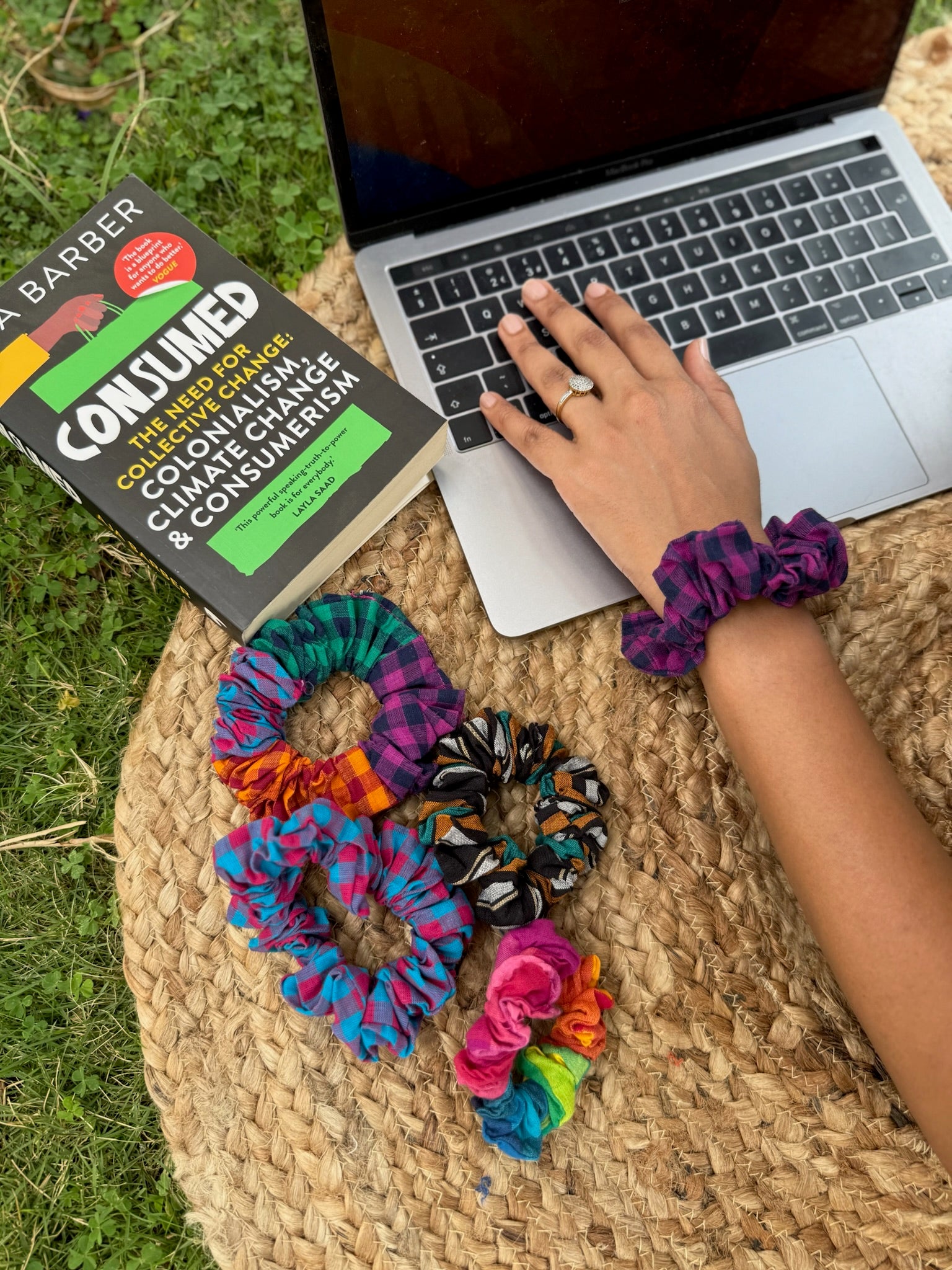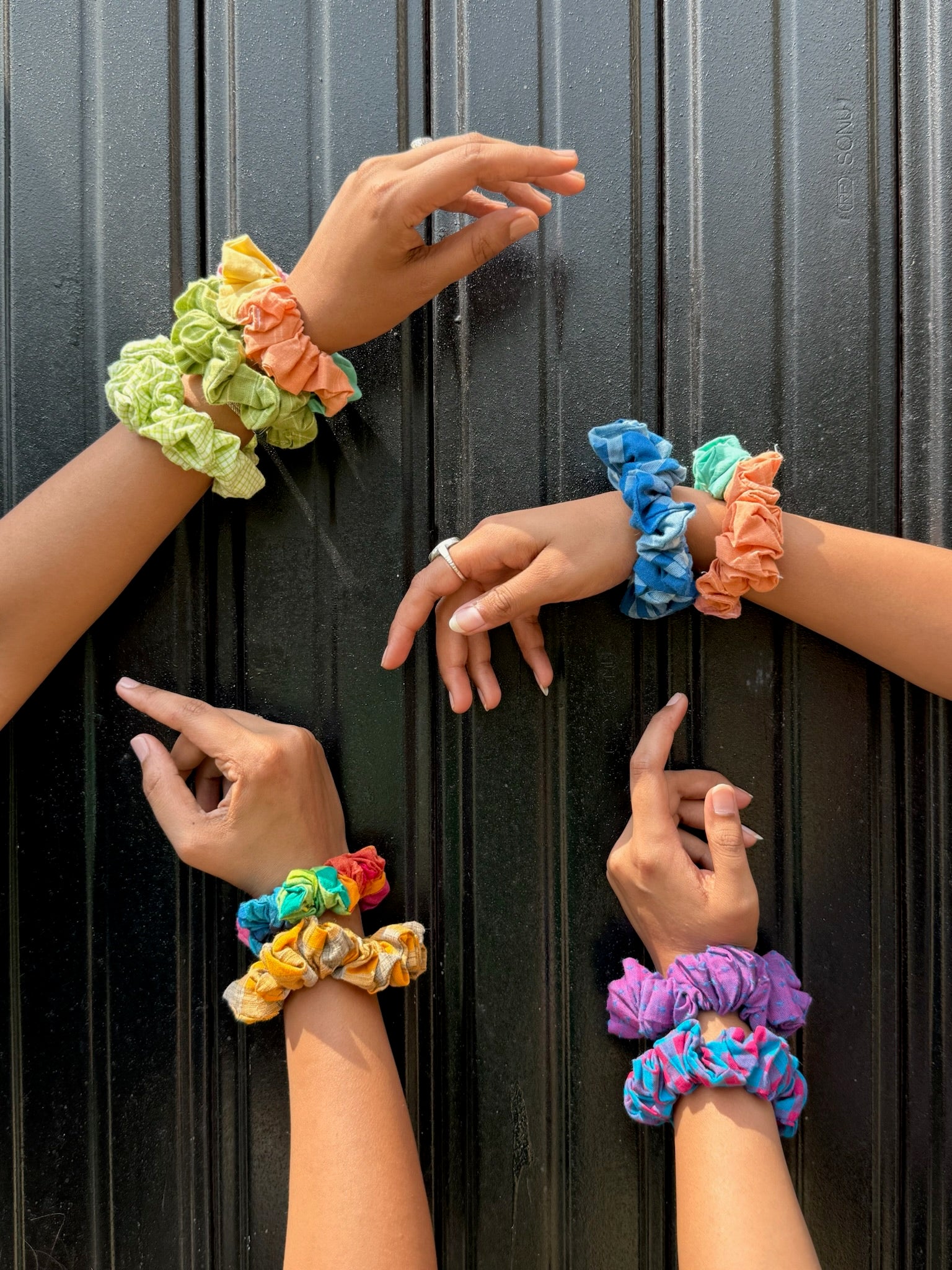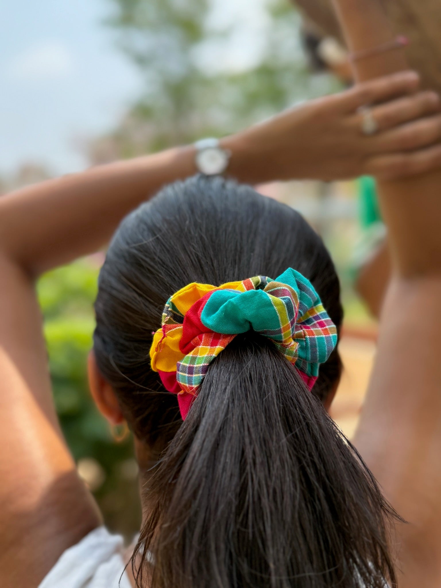 Crafted from handloom cotton fabric remnants from our garment collections, these scrunchies are thoughtfully upcycled to reduce waste and celebrate mindful design. Each scrunchie is unique, featuring a mix of colors and patterns. While the exact piece you receive may vary, every one is carefully selected to ensure it’s as beautiful as it is sustainable.