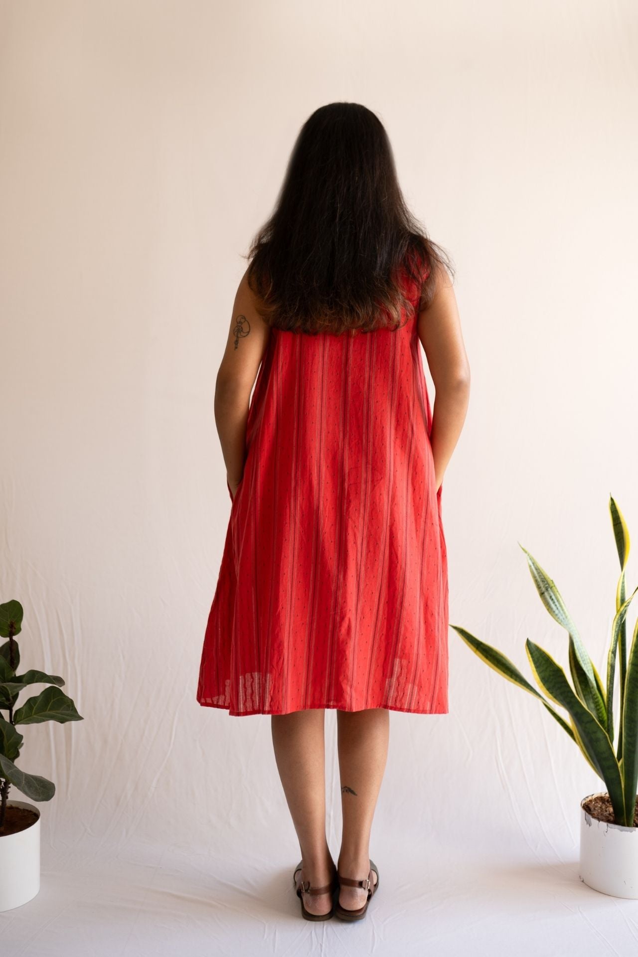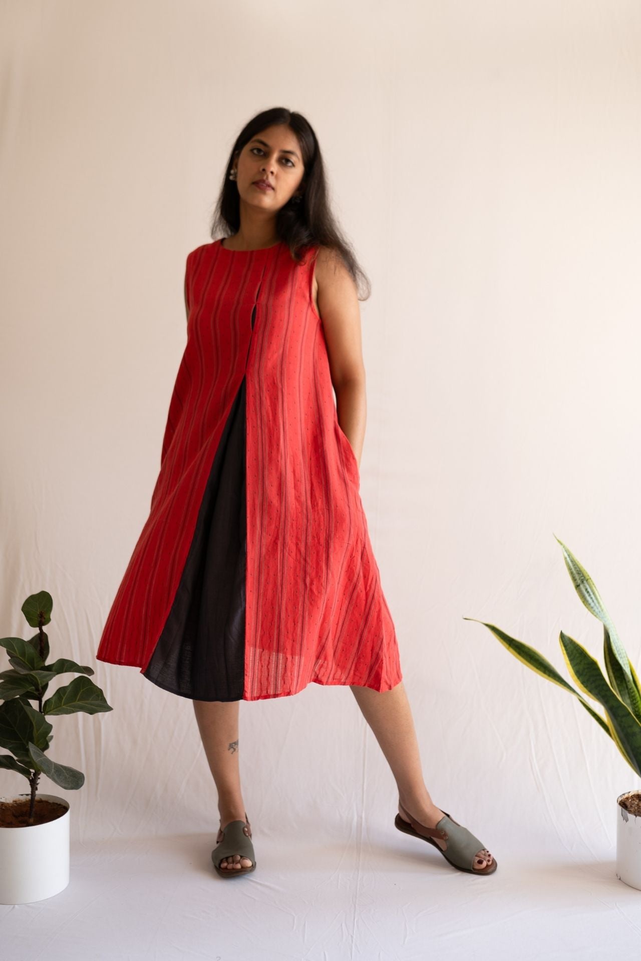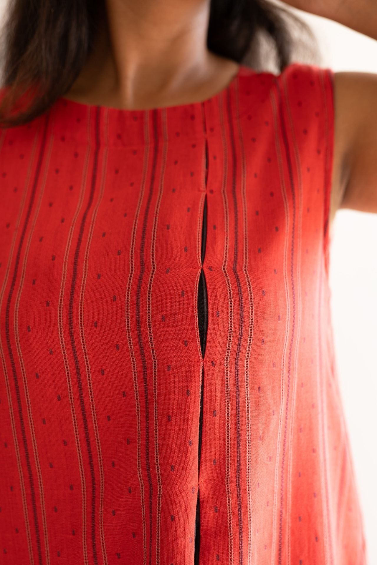 - A bold sleeveless dress in a rich crimson hue, designed to flow with grace and confidence.