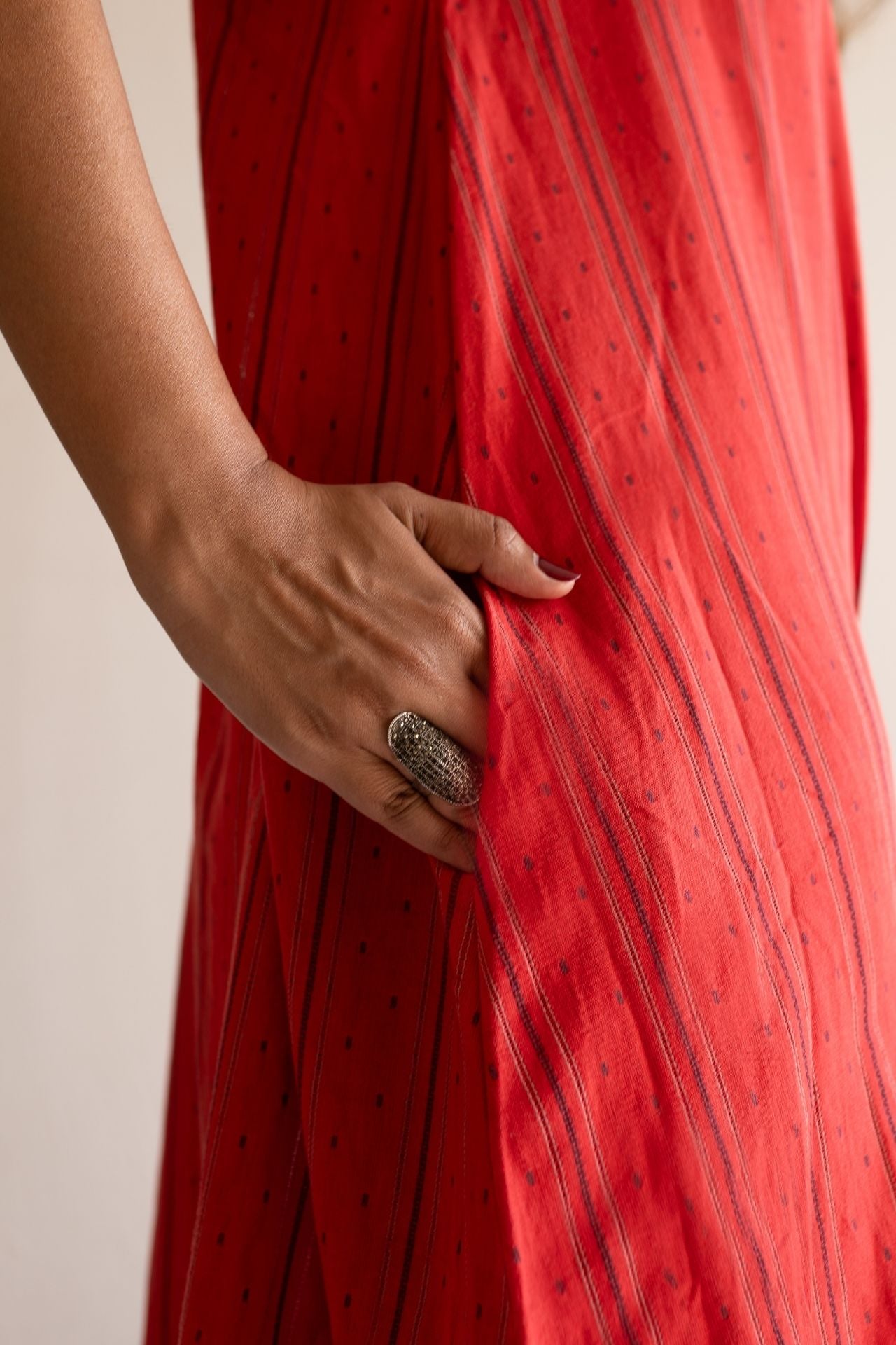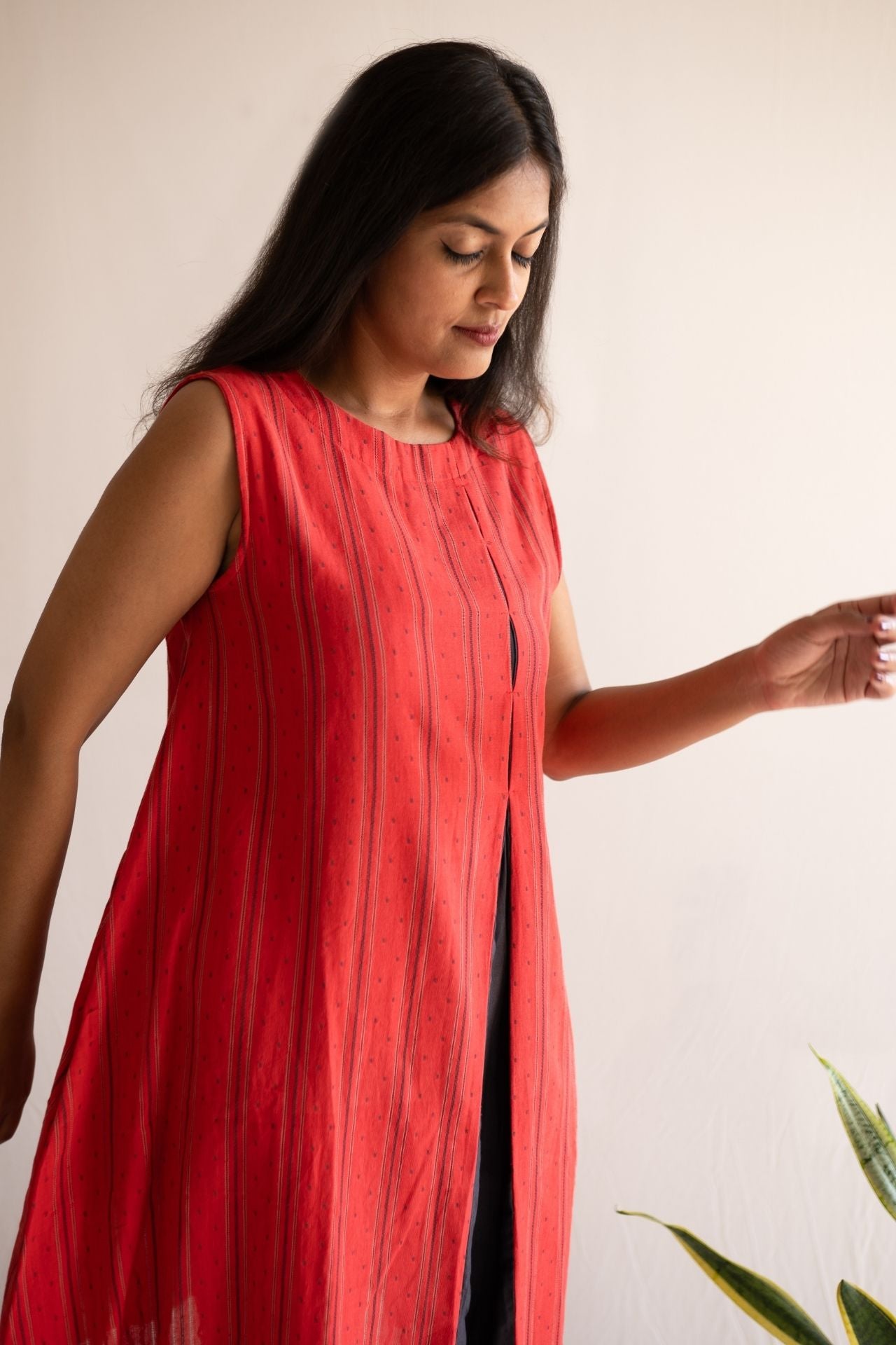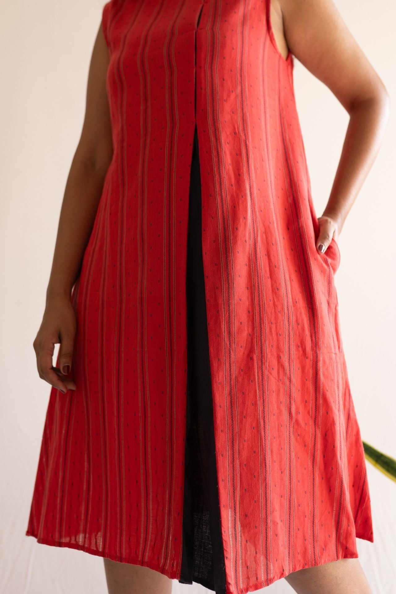 - A bold sleeveless dress in a rich crimson hue, designed to flow with grace and confidence.