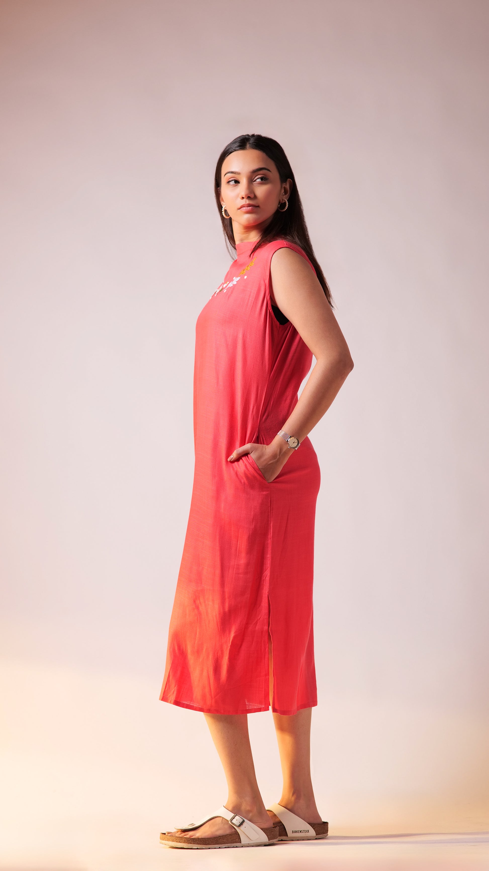 - Made from a breathable, lightweight fabric in a radiant coral-pink hue that exudes vibrancy and warmth, ideal for both casual and semi-formal settings.