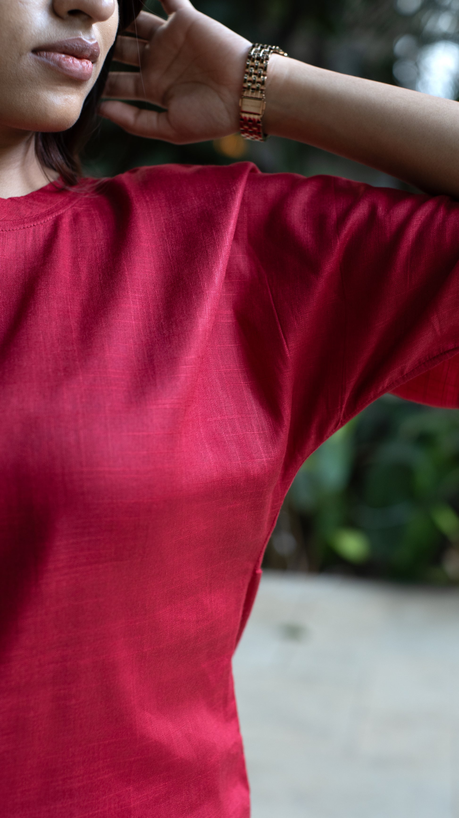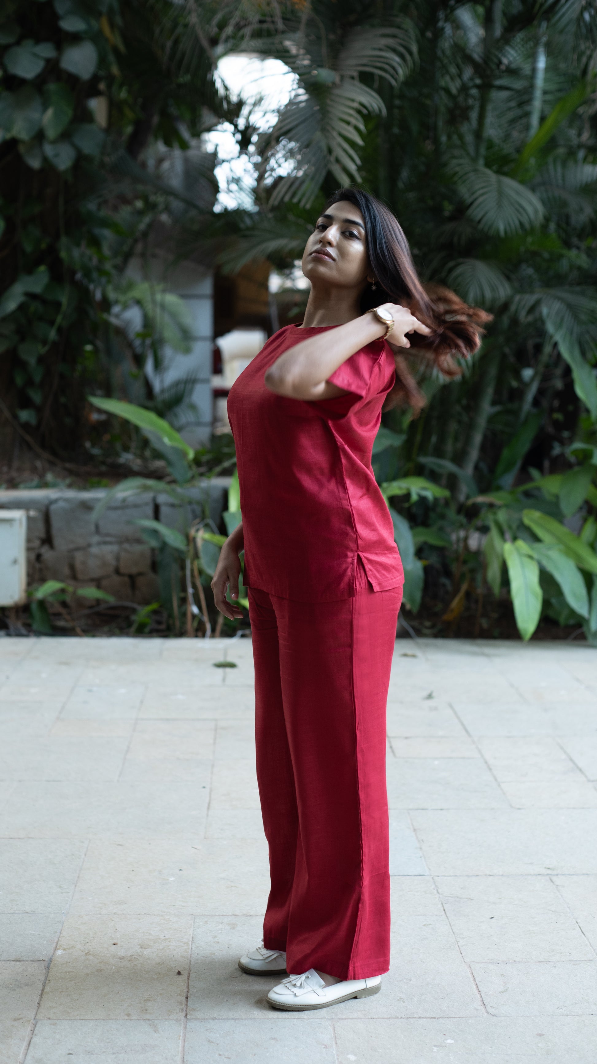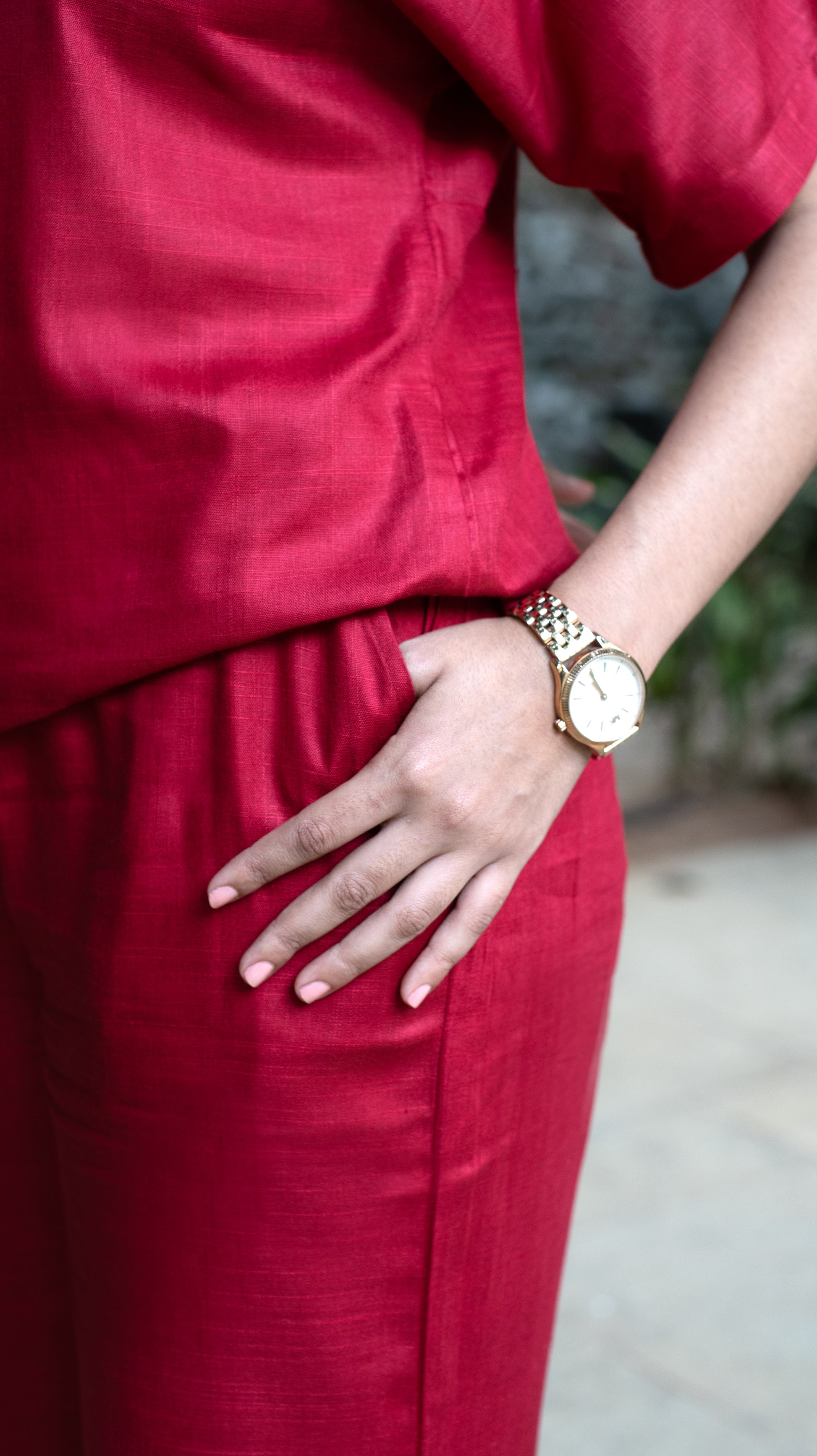 - Minimalist design with a rich, deep red hue, adding a refined yet cozy aesthetic to the ensemble.