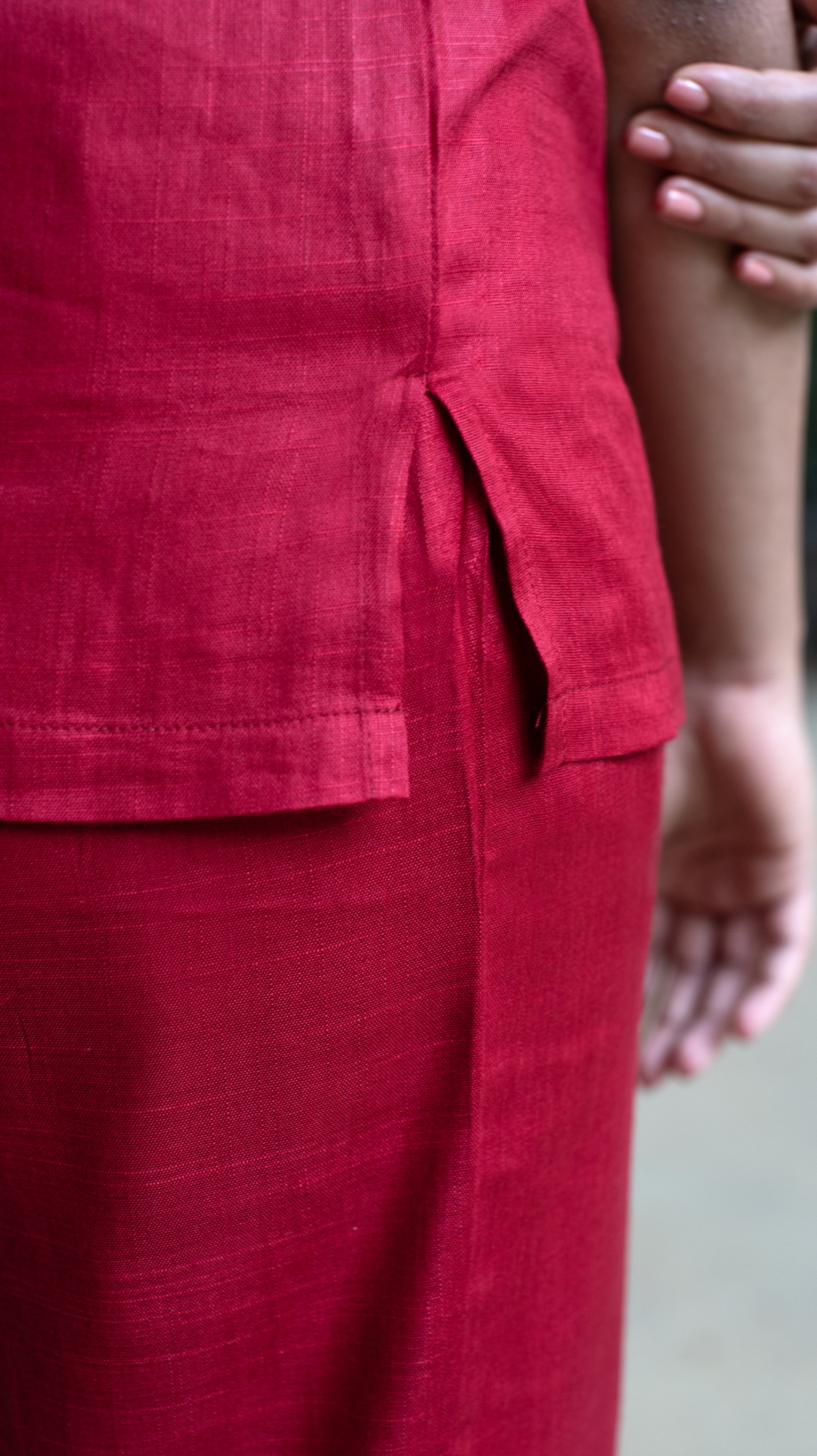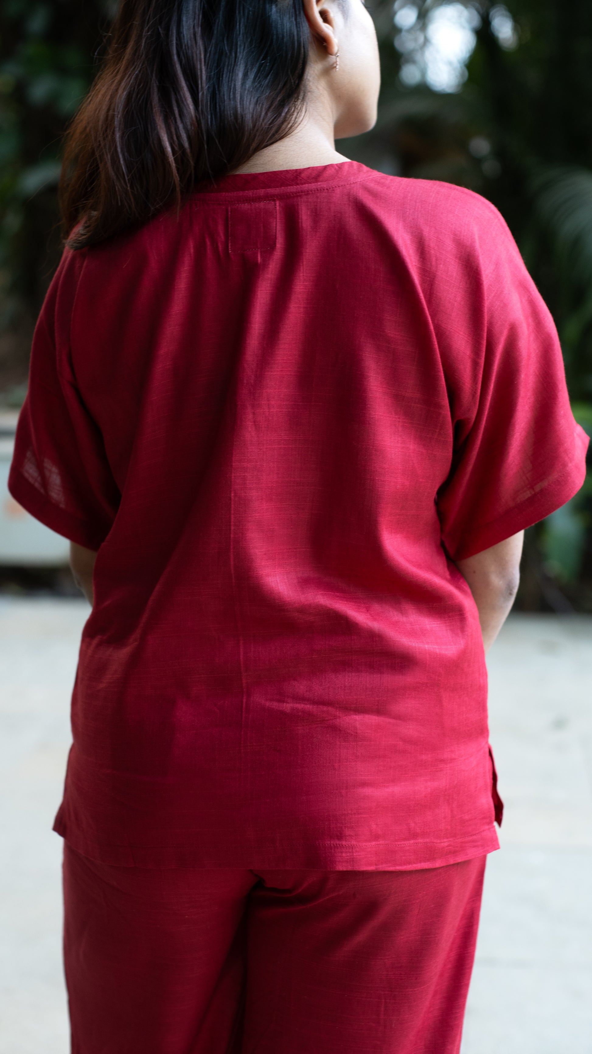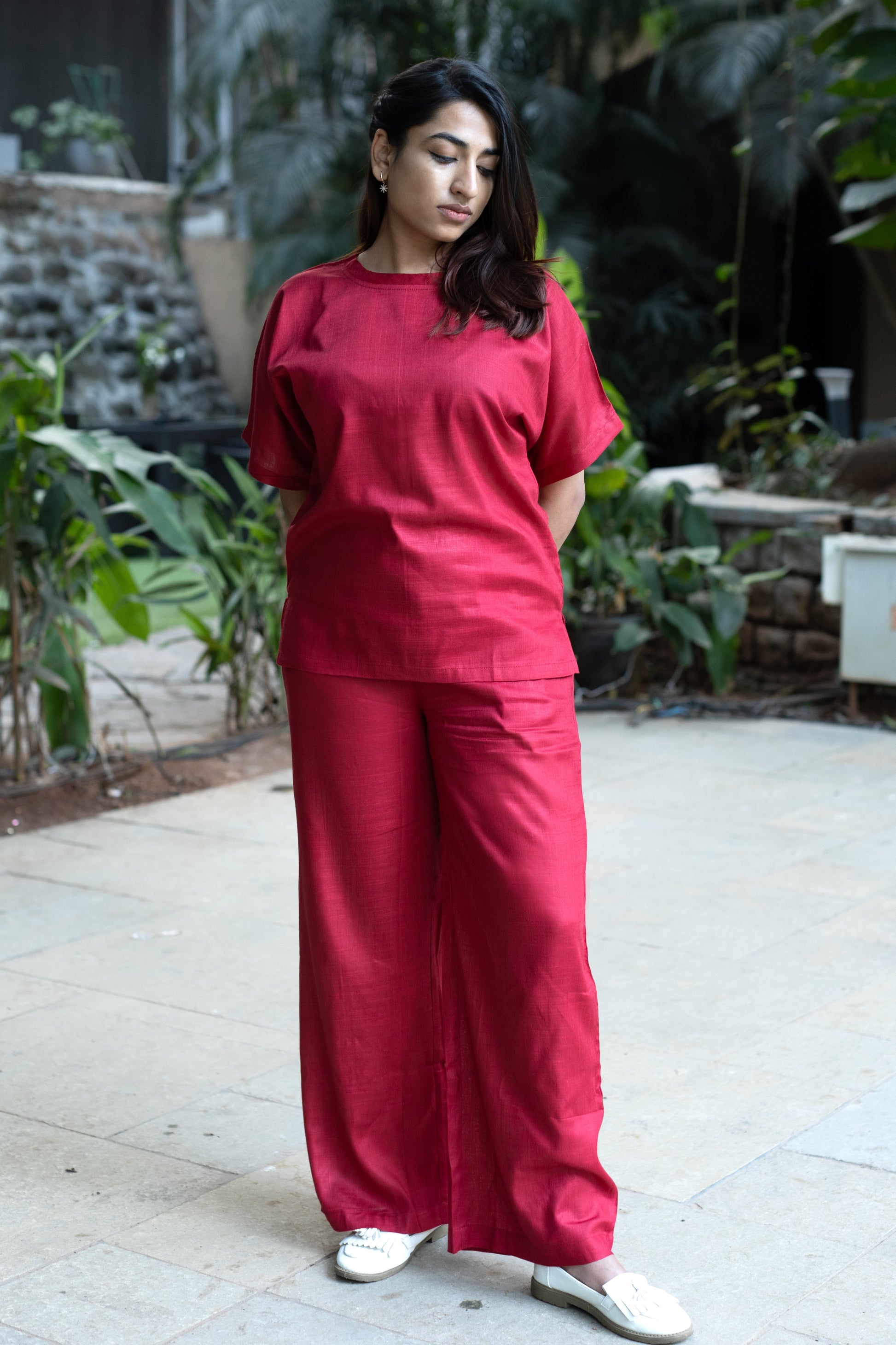 - Minimalist design with a rich, deep red hue, adding a refined yet cozy aesthetic to the ensemble.