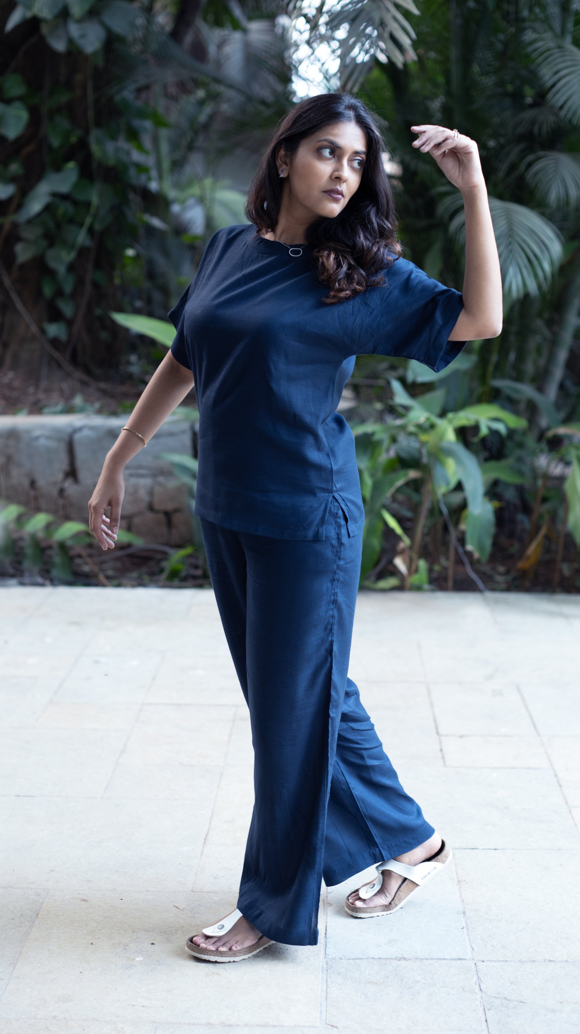 - Tailored wide-leg pants with a soft waistband, providing a flattering silhouette while maintaining ease of wear.