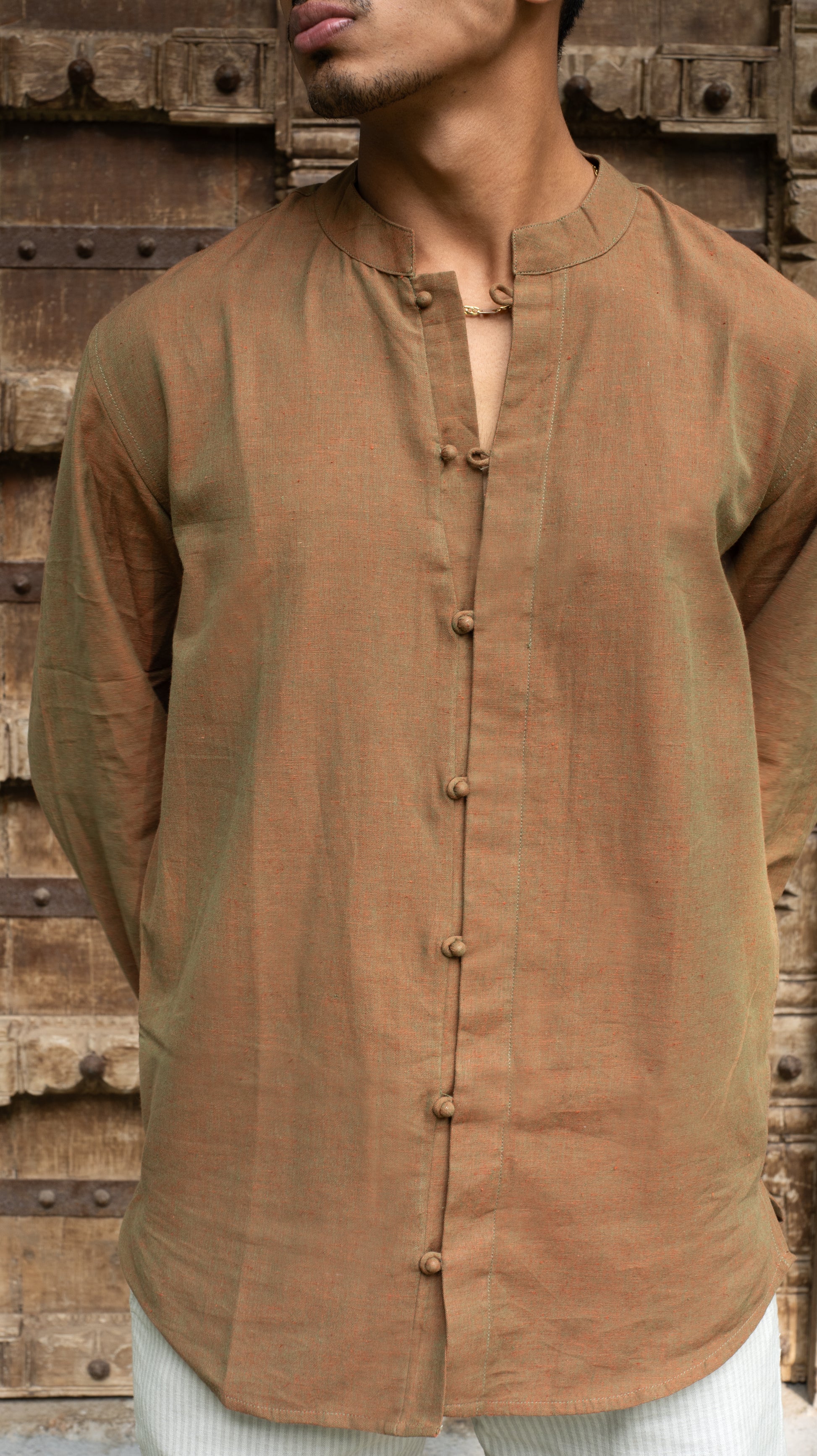 - Chinese collar with hand-knotted button-down closure, offering a minimalist and sophisticated silhouette.