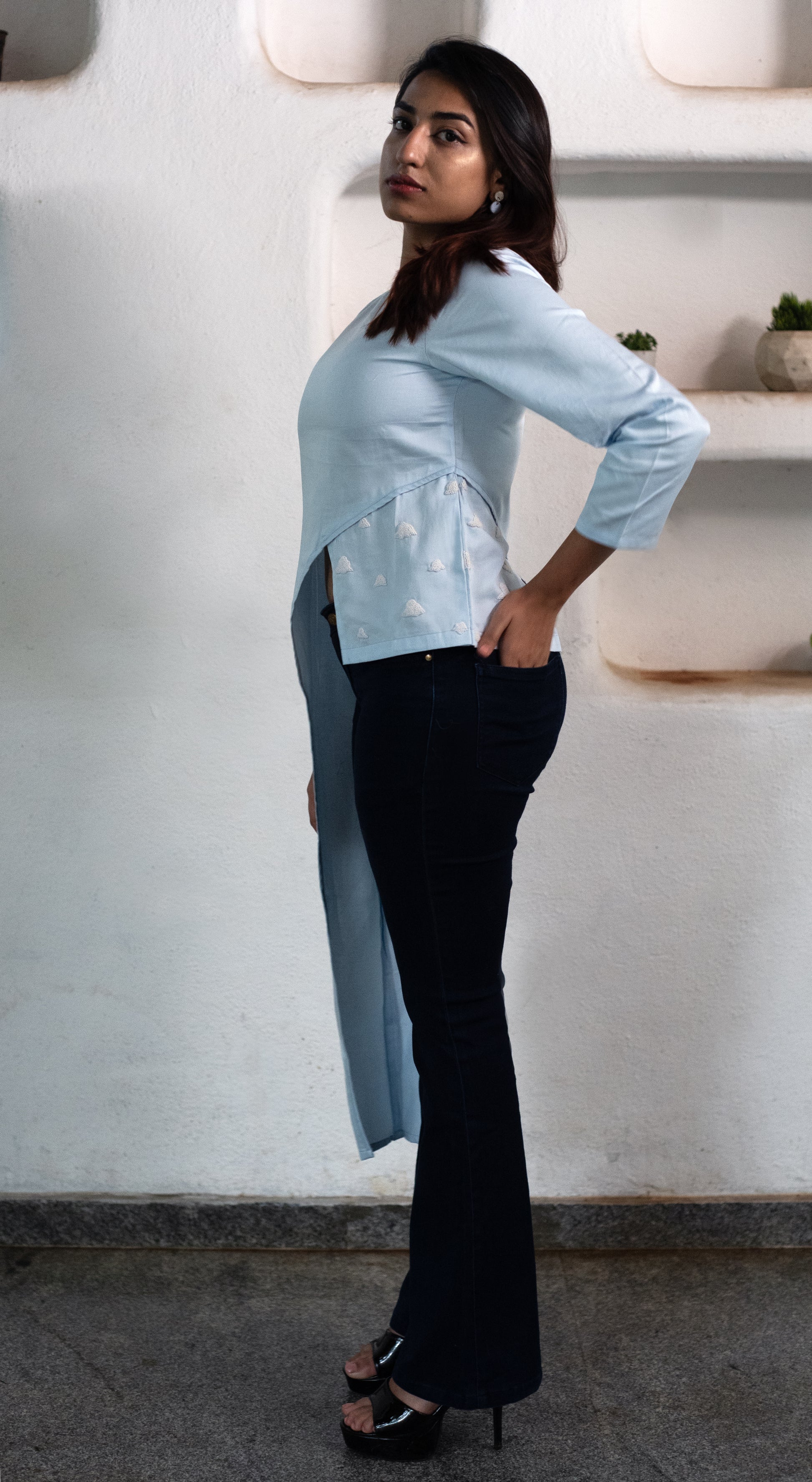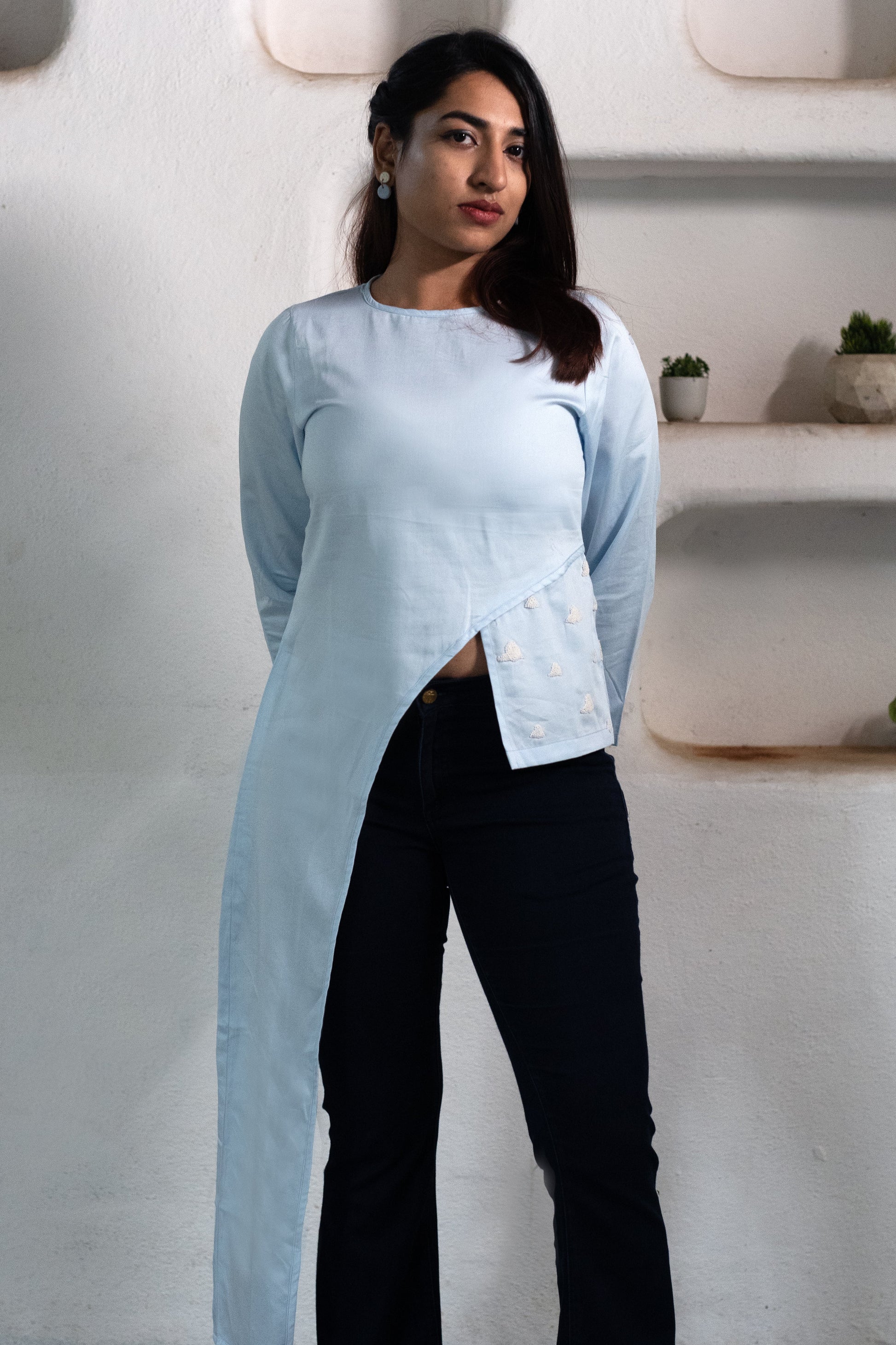 - Designed with full sleeves and an asymmetric silhouette, blending elegance with contemporary style.