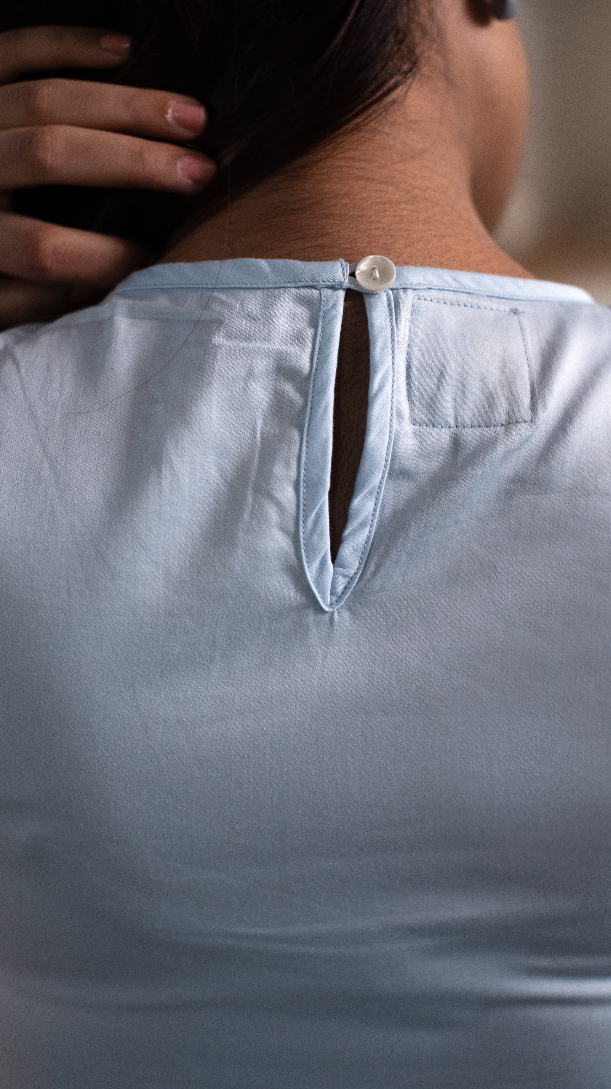 - A soothing sky blue hue, evoking serenity and sophistication that pairs effortlessly with wide-leg cotton pants or denim, perfect for a chic yet laid-back look
