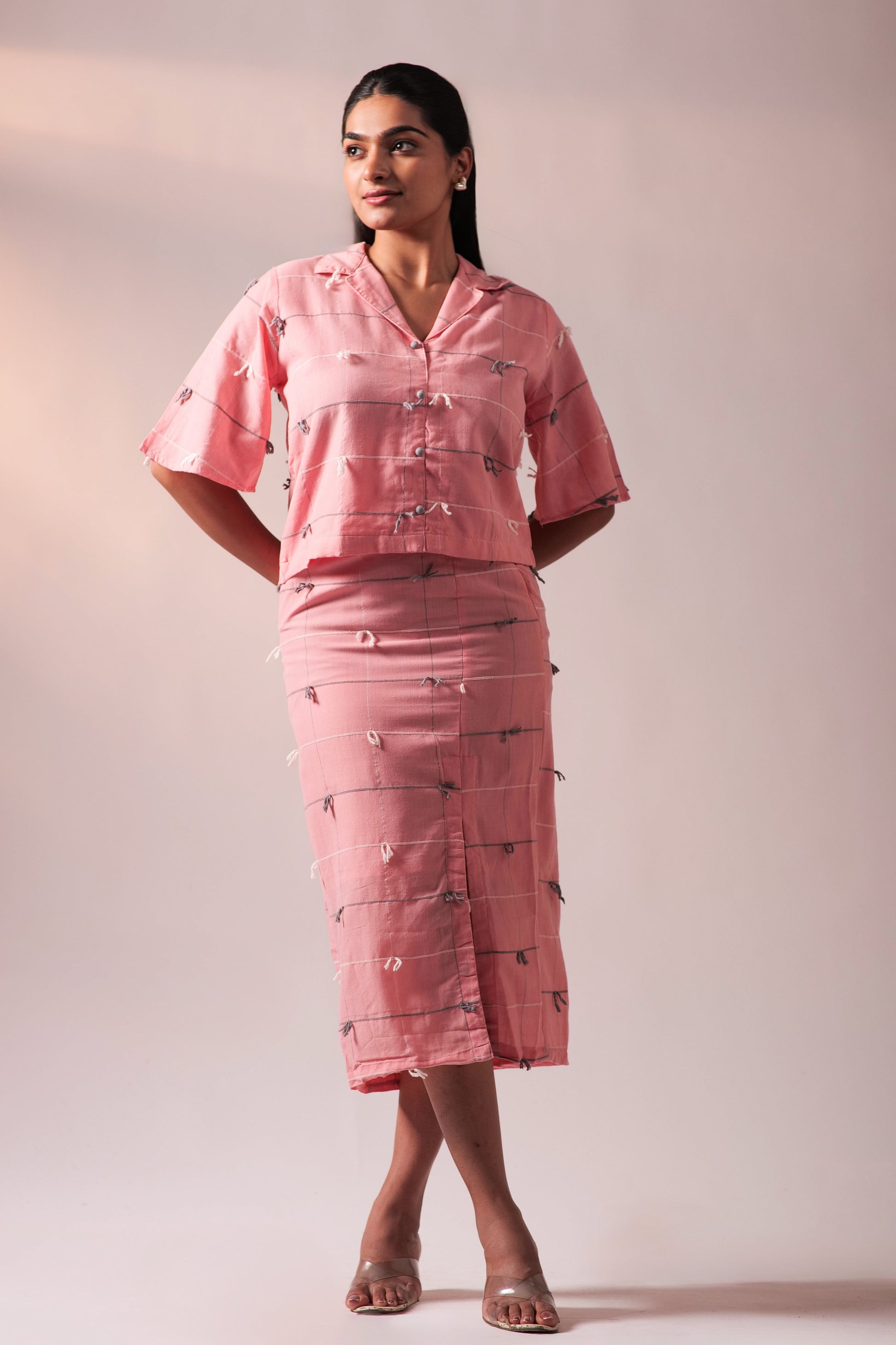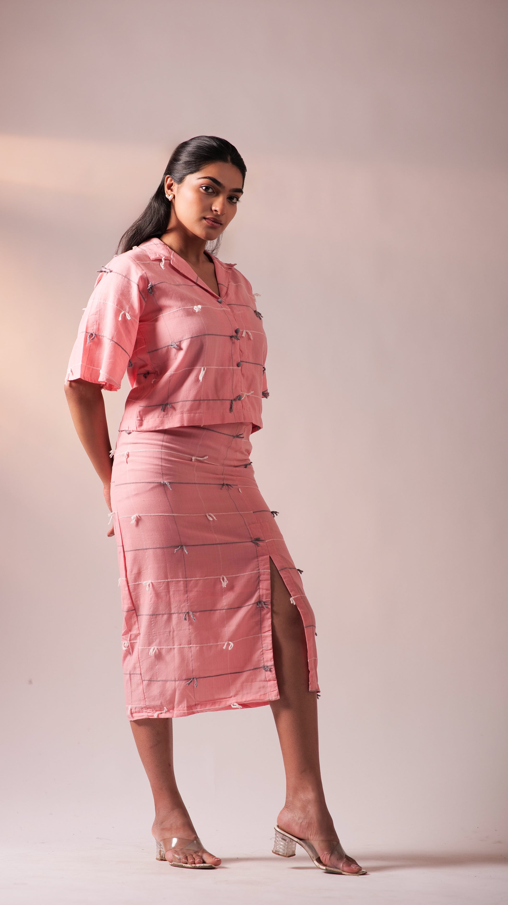 - The skirt is high-waisted, designed to complement the crop shirt, and includes a bold front slit that enhances movement.