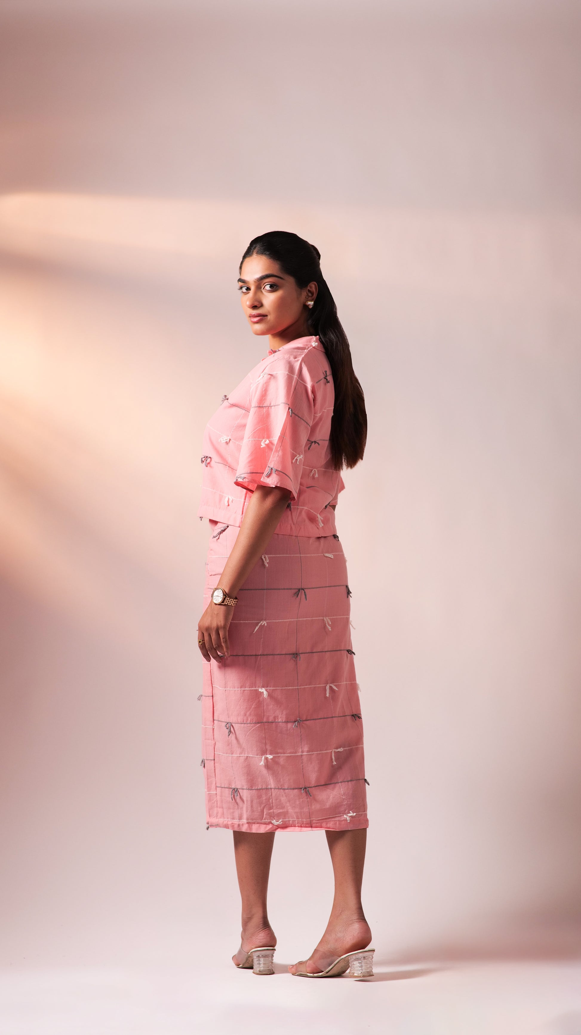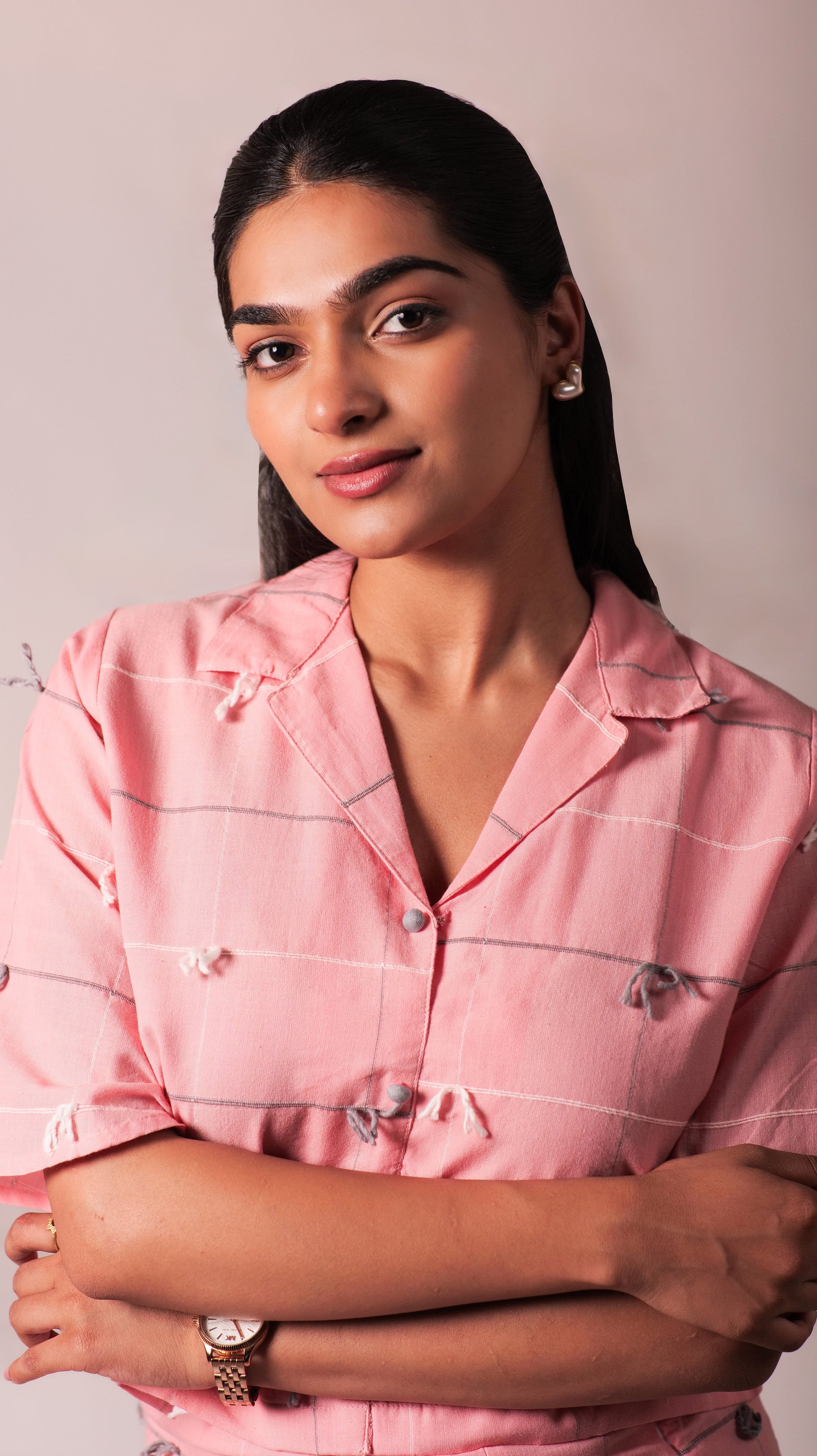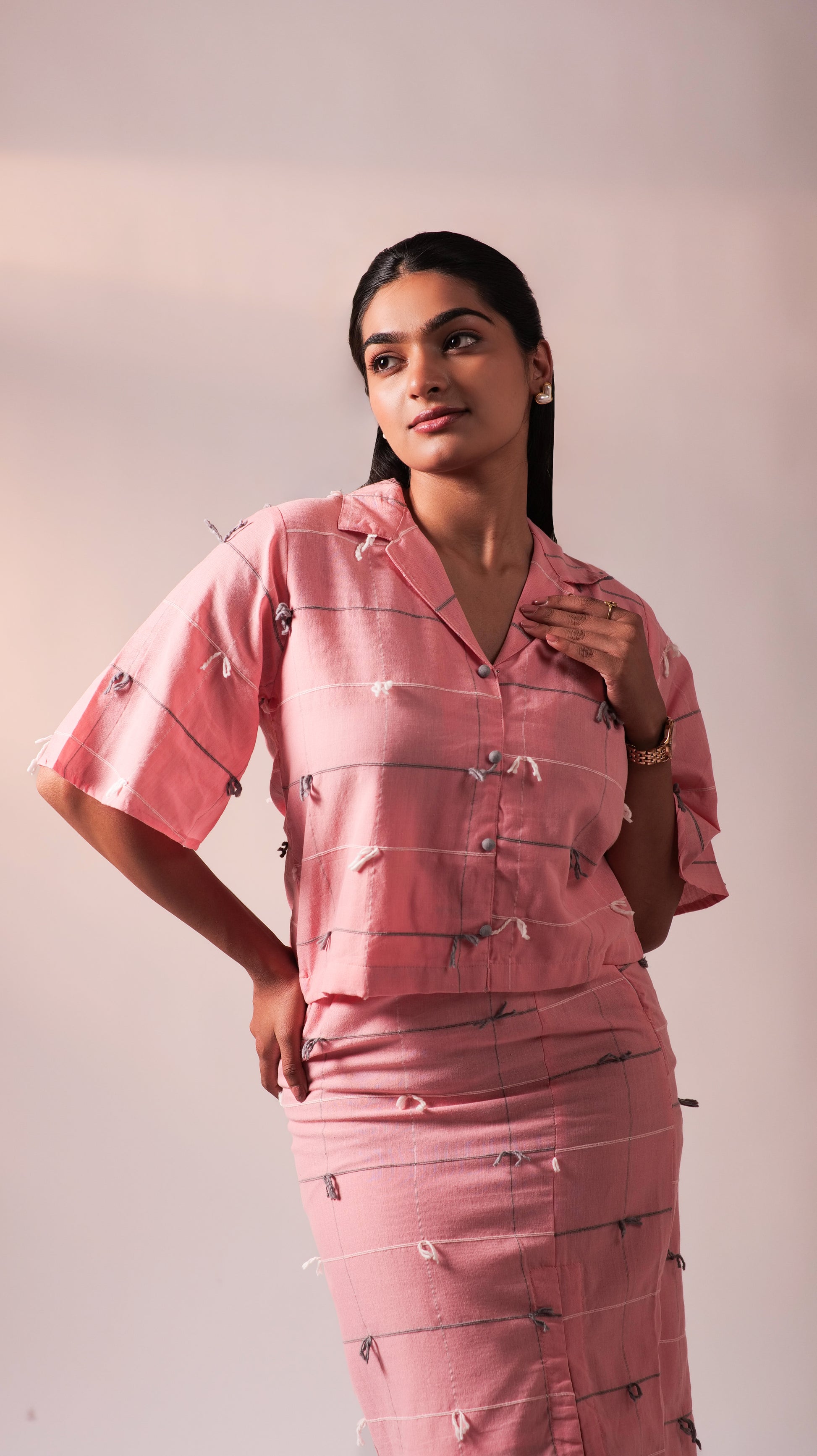 - The top is a boxy, button-down crop shirt with elbow-length sleeves, offering a relaxed yet tailored vibe.