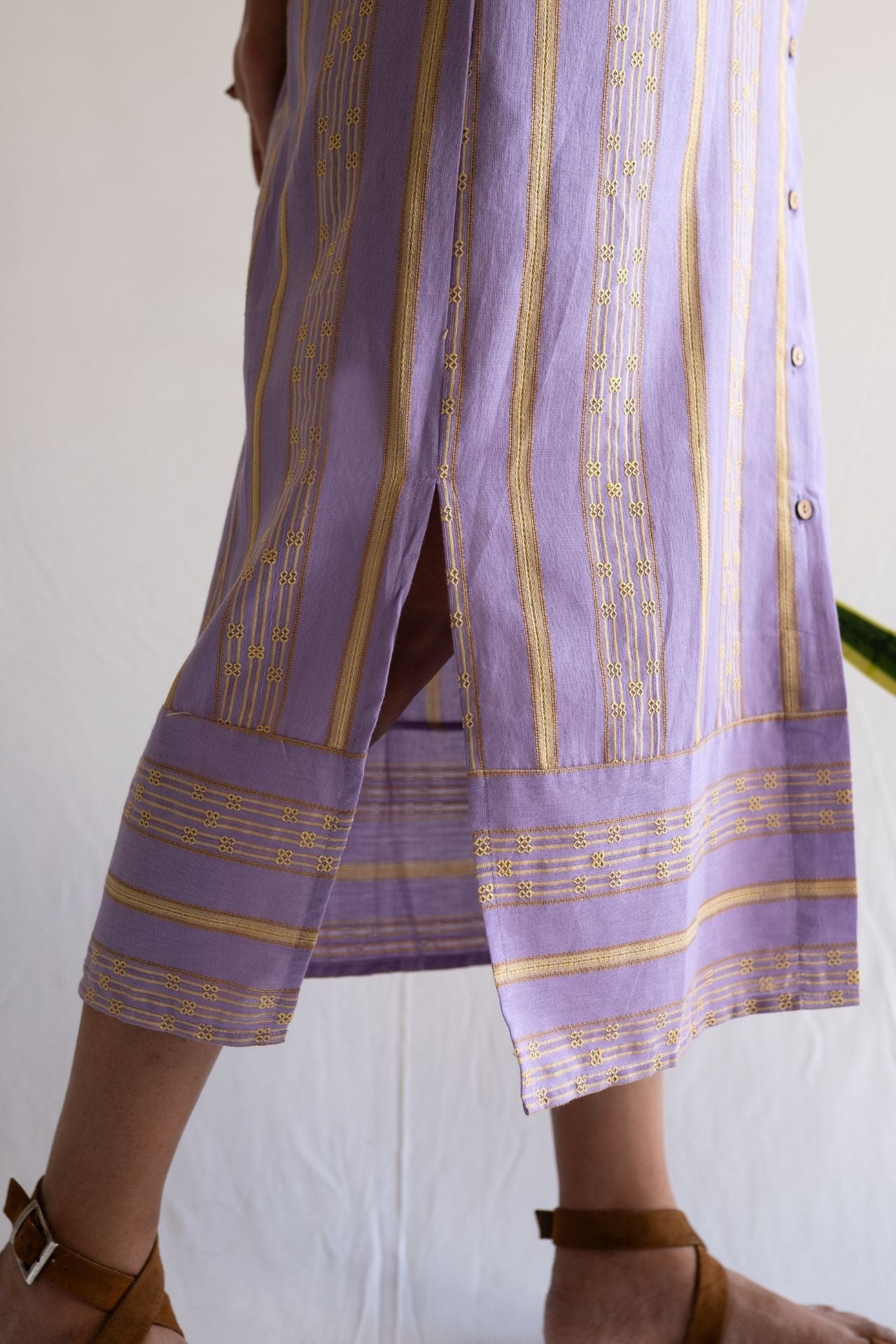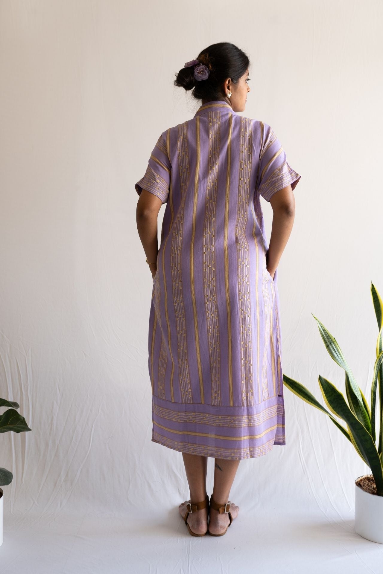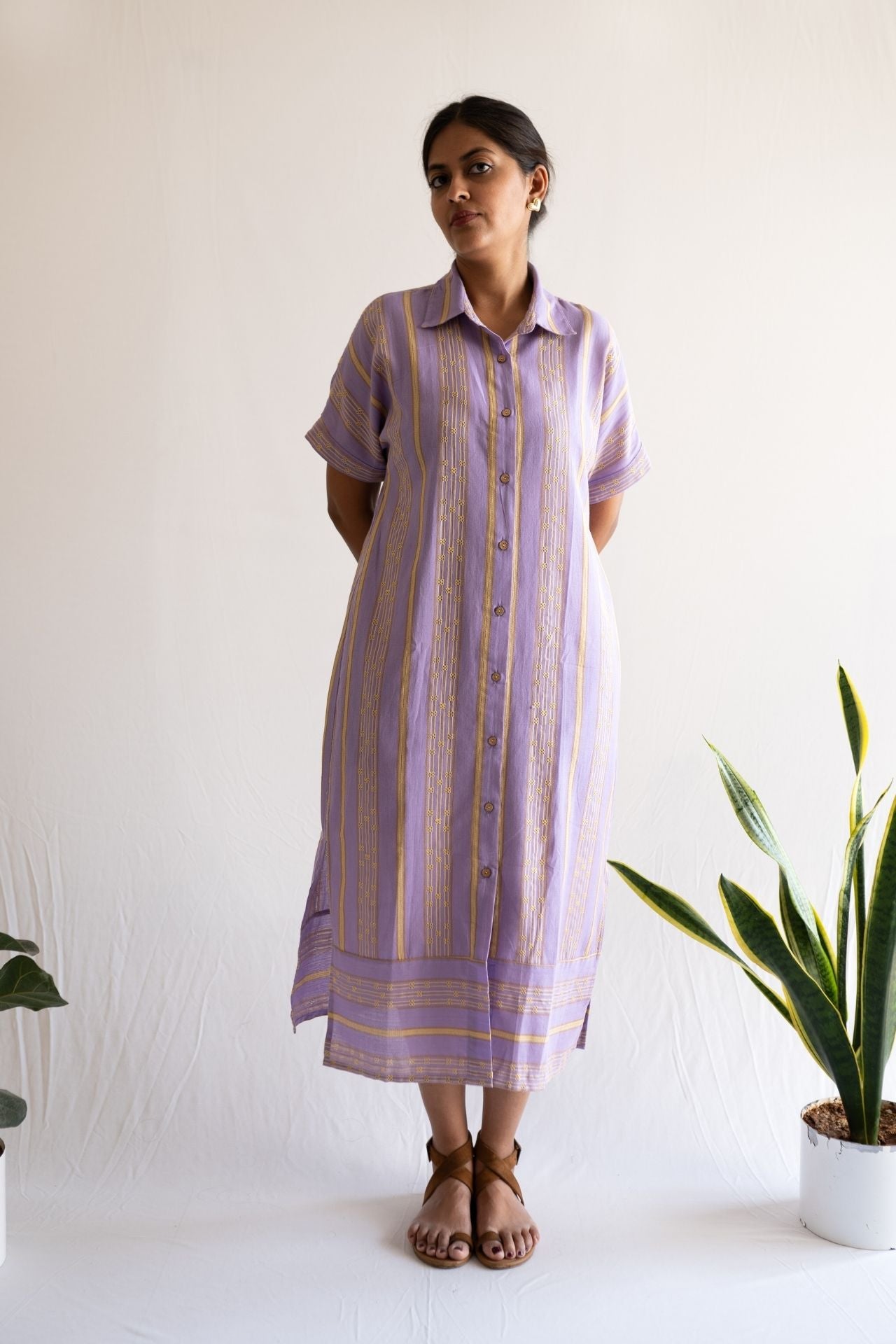 - A breezy midi shirt dress in a soothing lavender hue, uplifted by mustard handwoven stripe patterns.