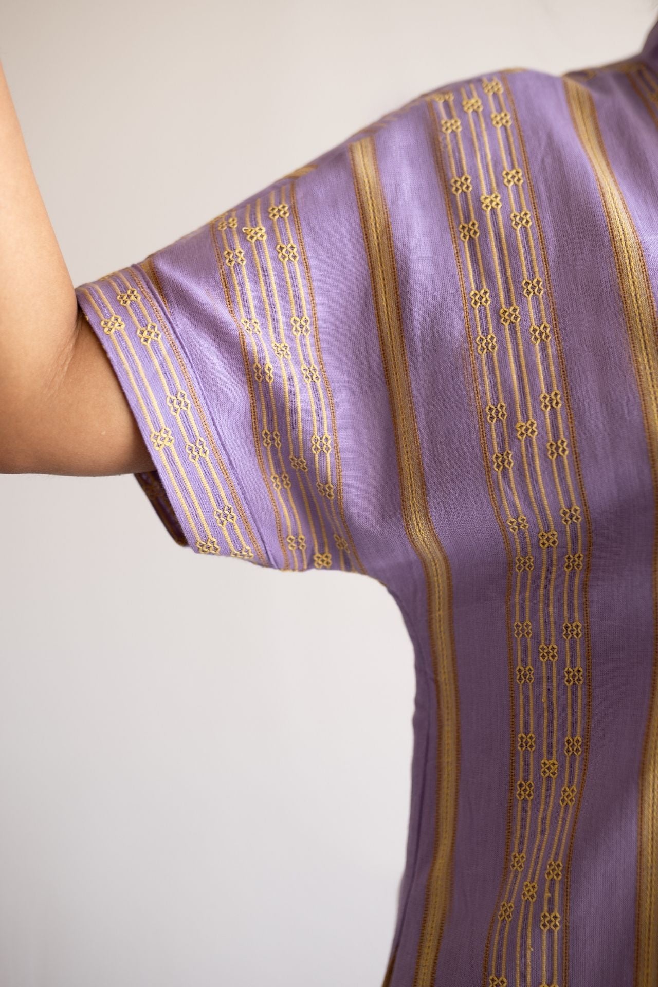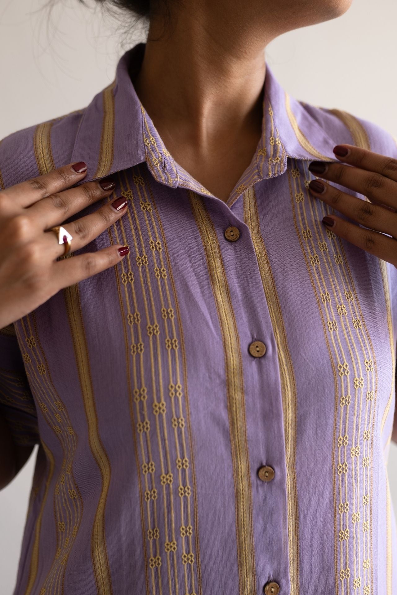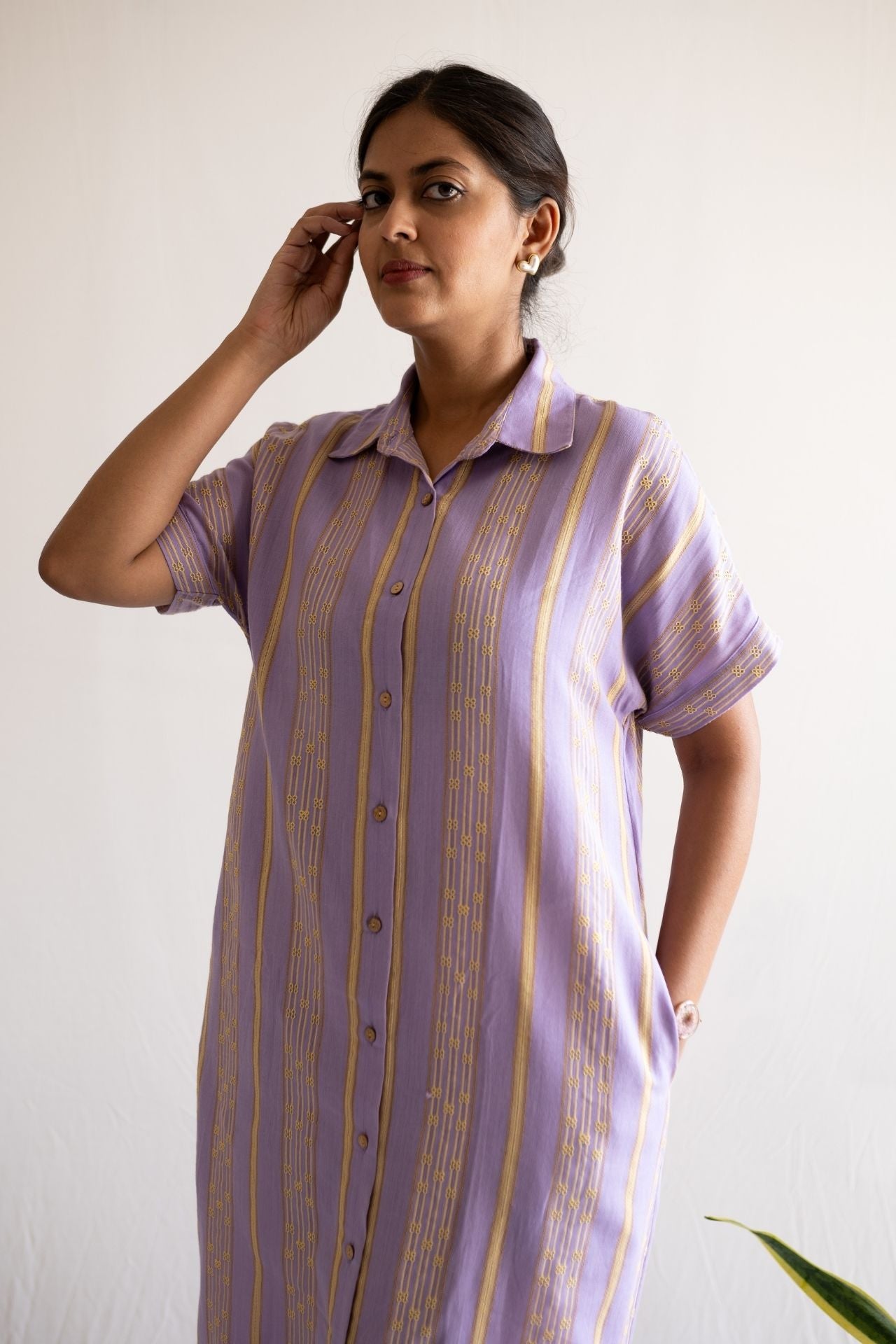 - A breezy midi shirt dress in a soothing lavender hue, uplifted by mustard handwoven stripe patterns.