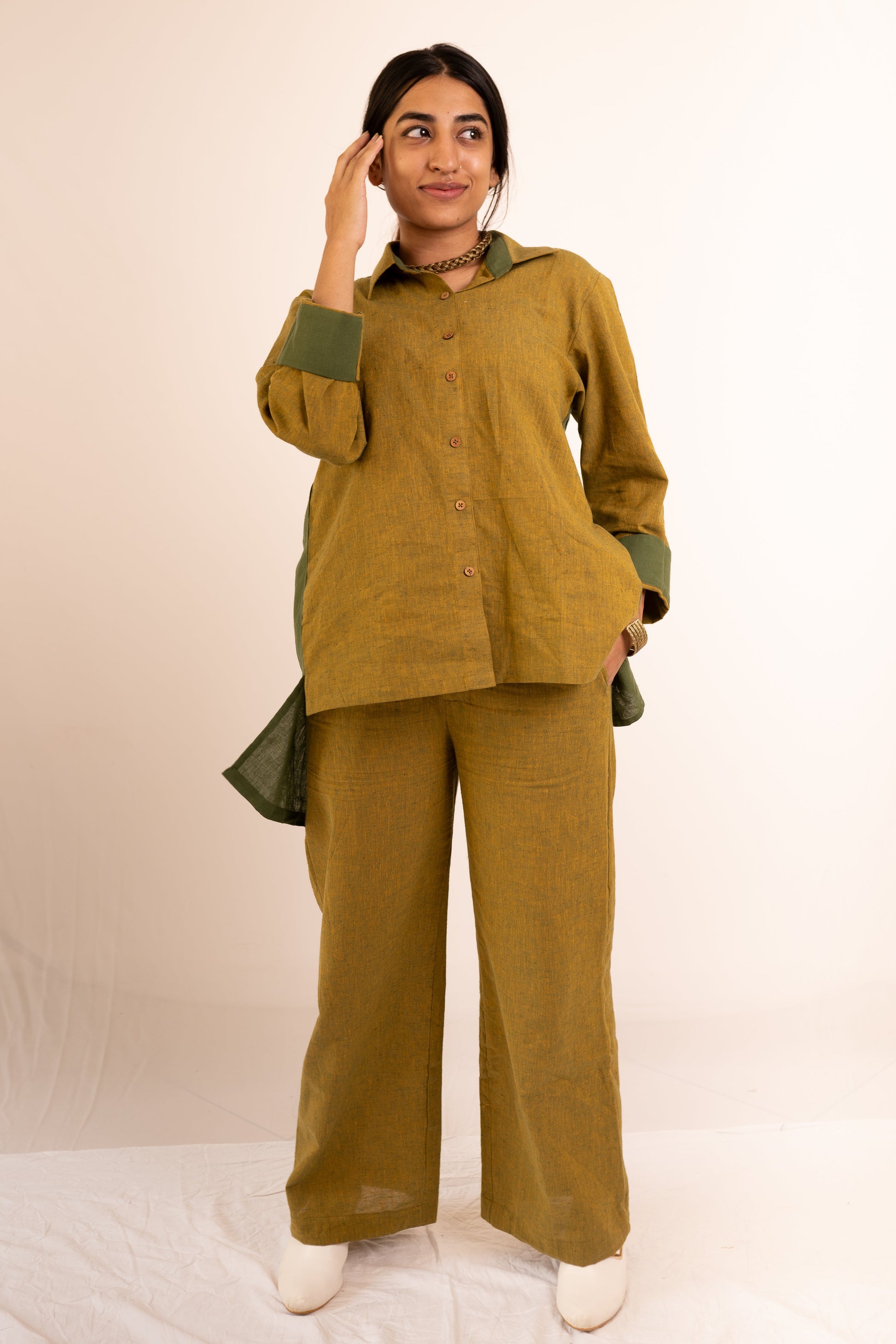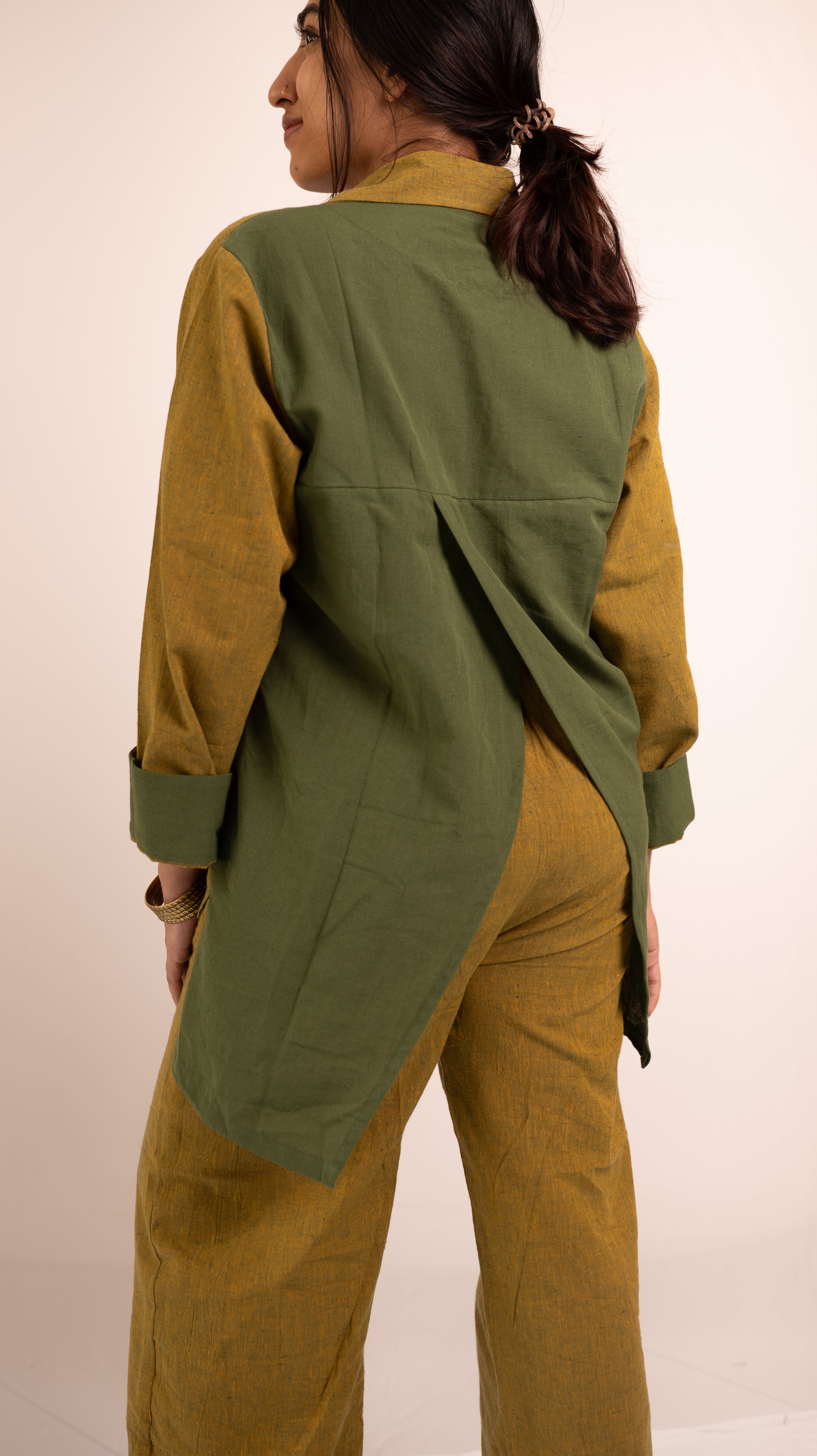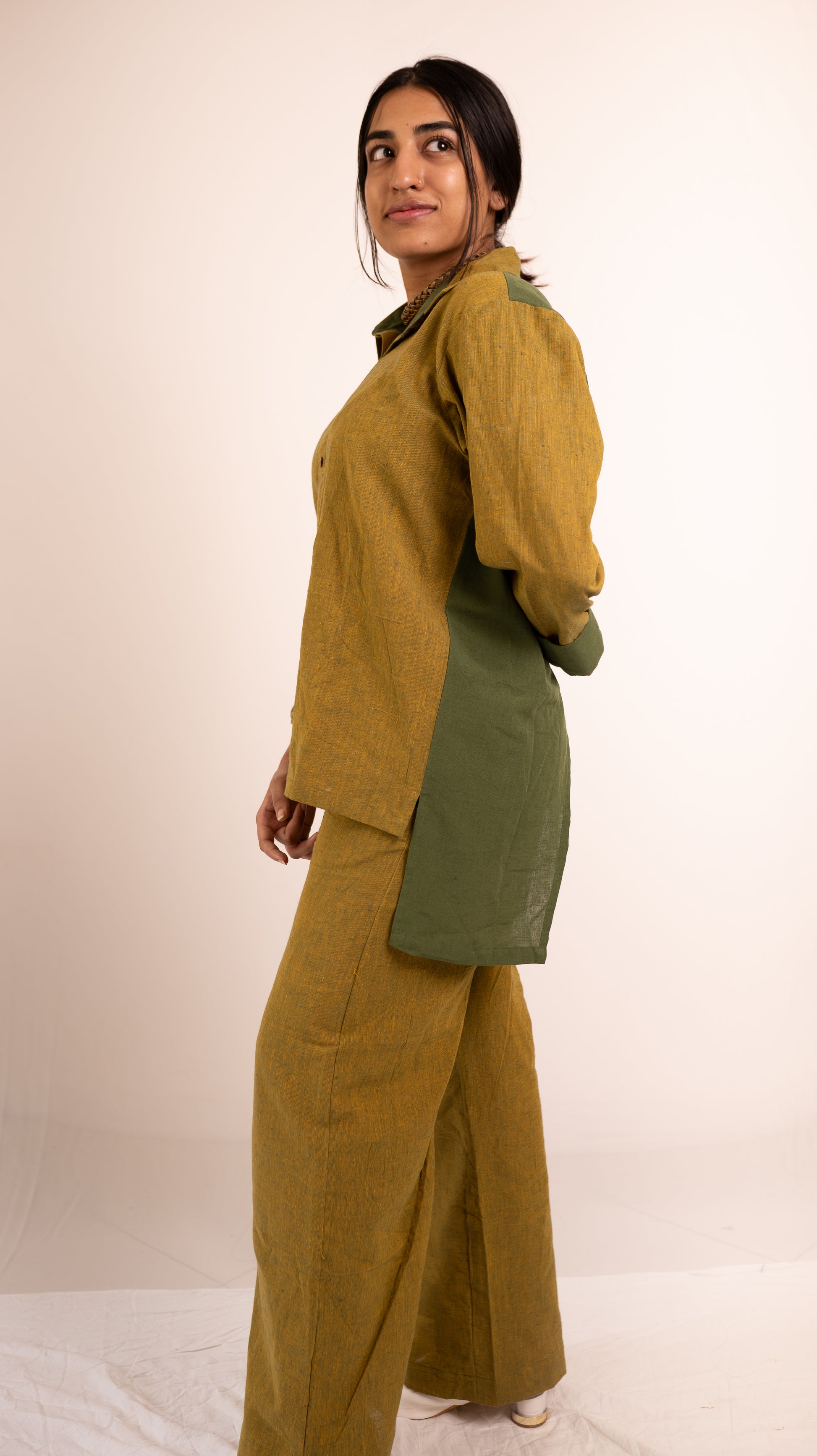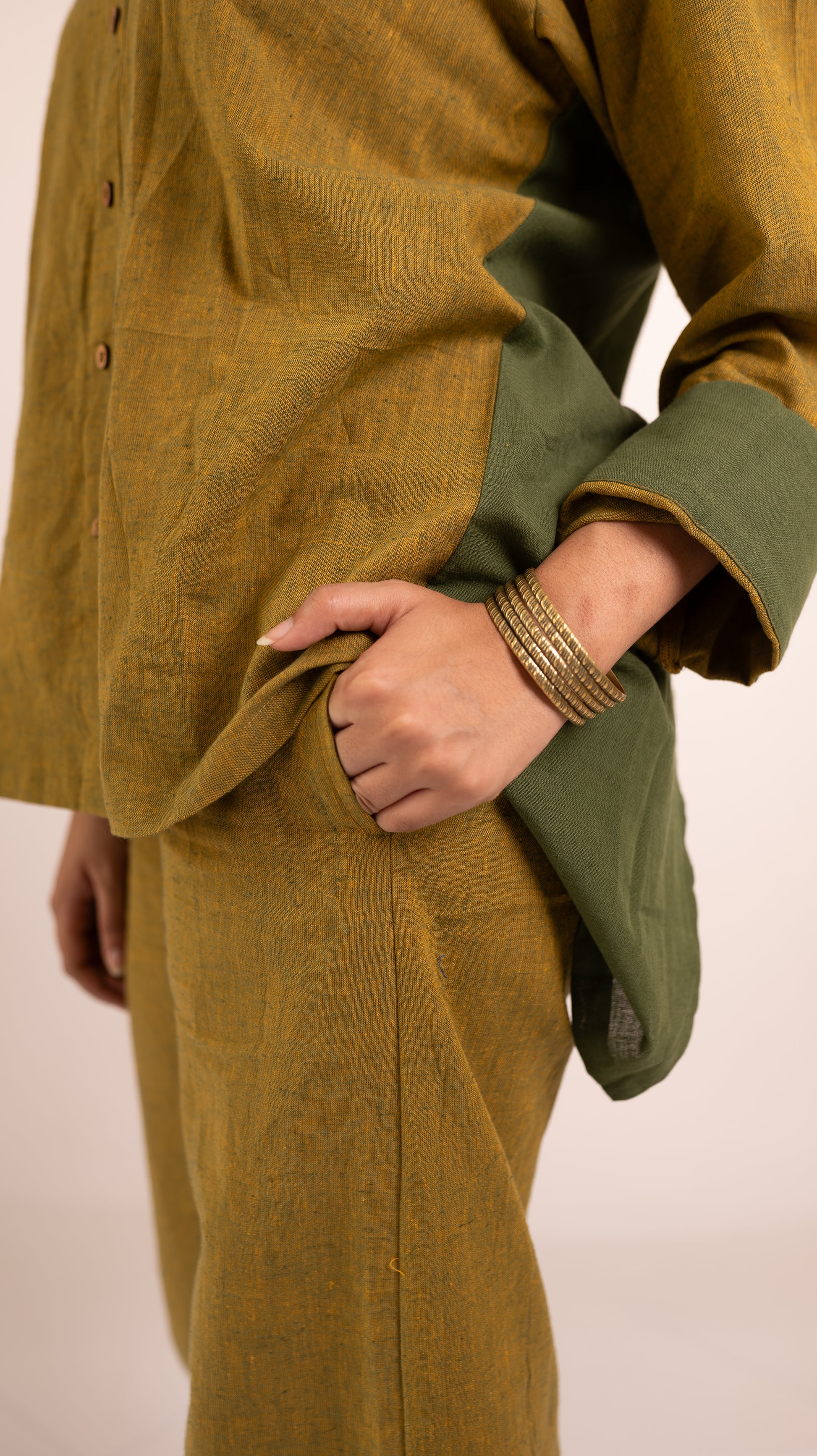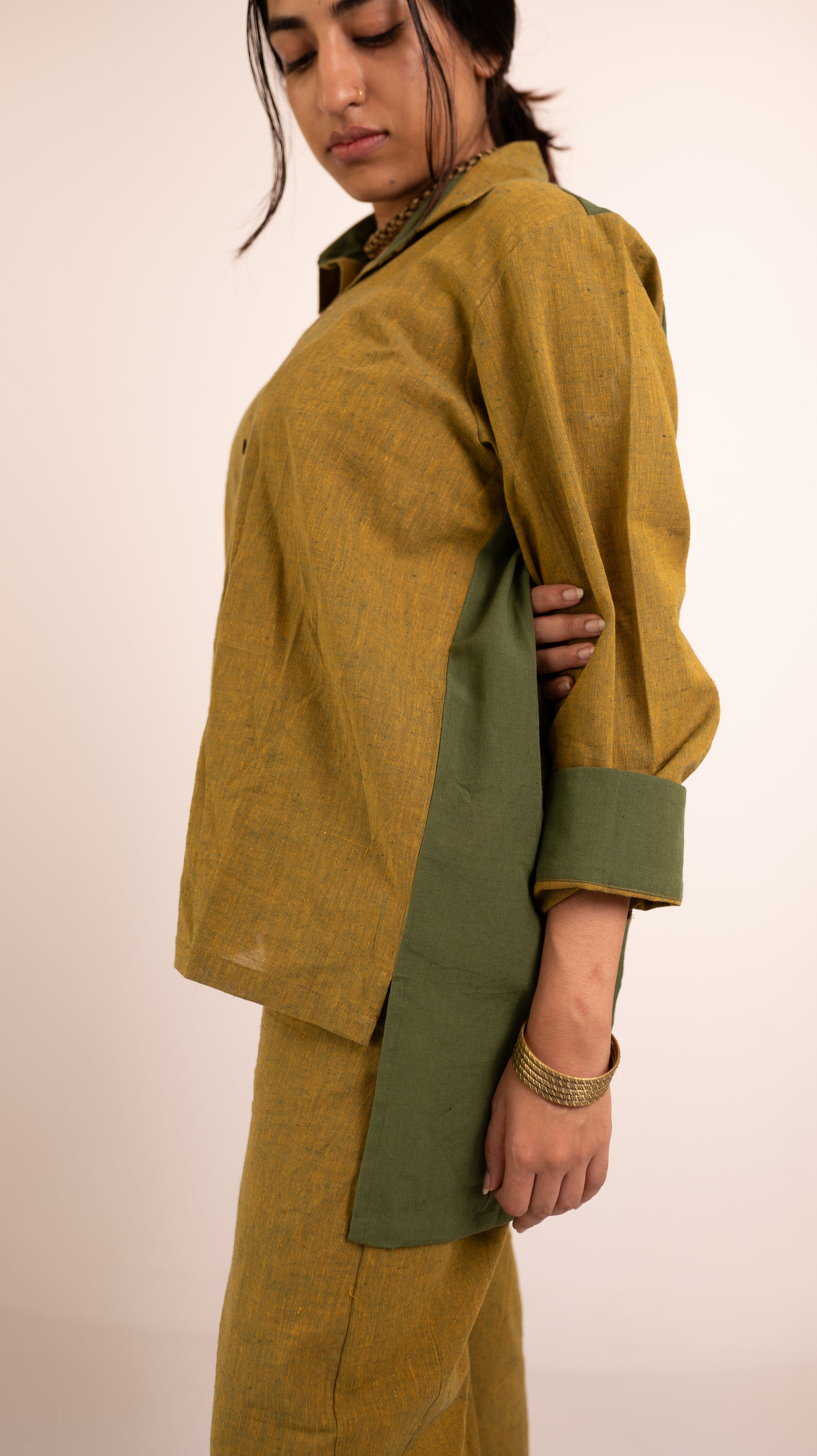 - The outfit features a vibrant blend of mustard and olive, giving it an ochre-coloured texture. The shirt is predominantly yellow with bold olive accents, especially noticeable on the back panel and the inner side of the sleeves, which are revealed when rolled up.