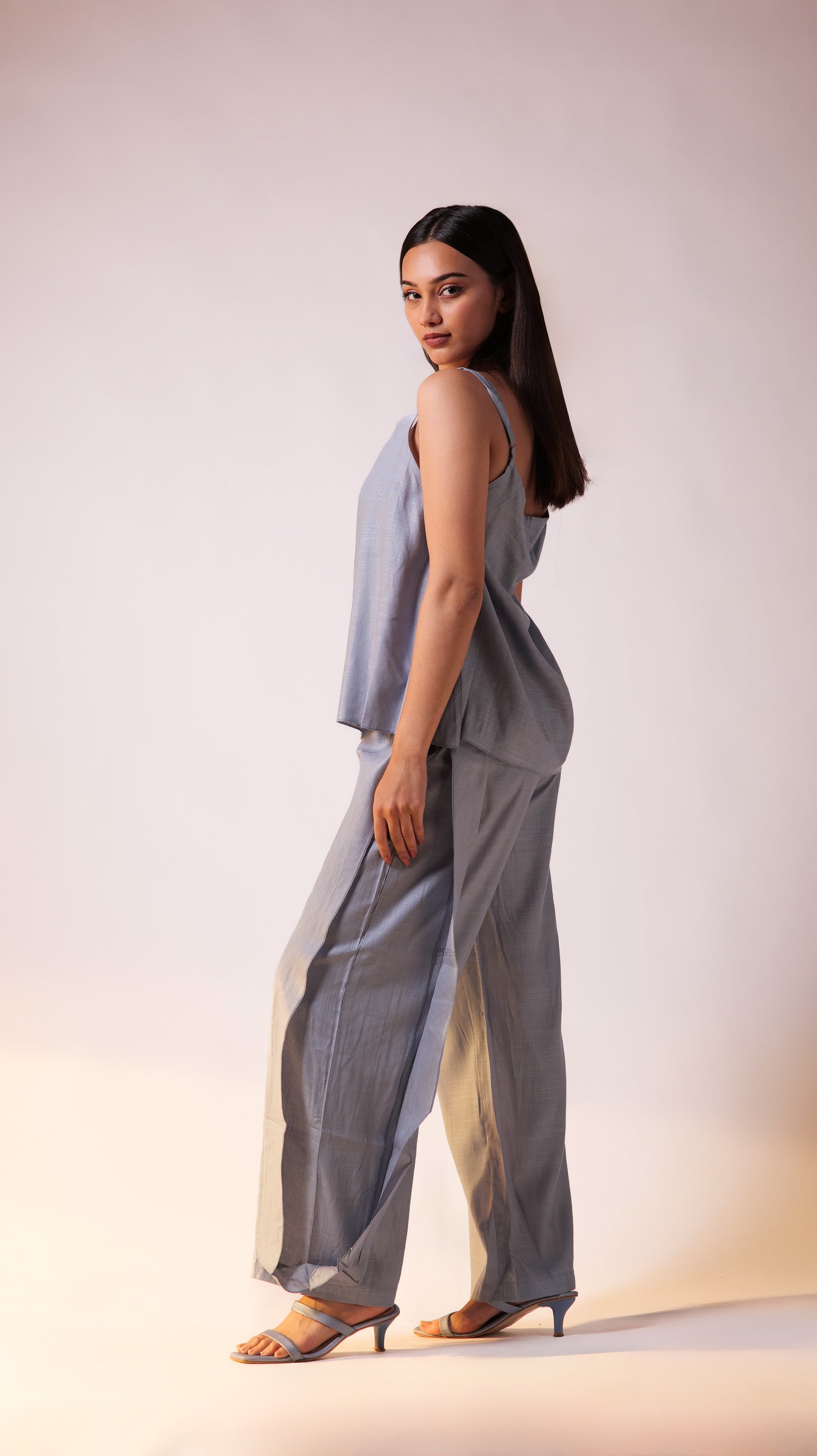 - The light, sky blue colour of the set is versatile and calming, enhancing the outfit's connection to natural elements. This neutral palette allows for easy accessorising with either bold or understated jewellery.