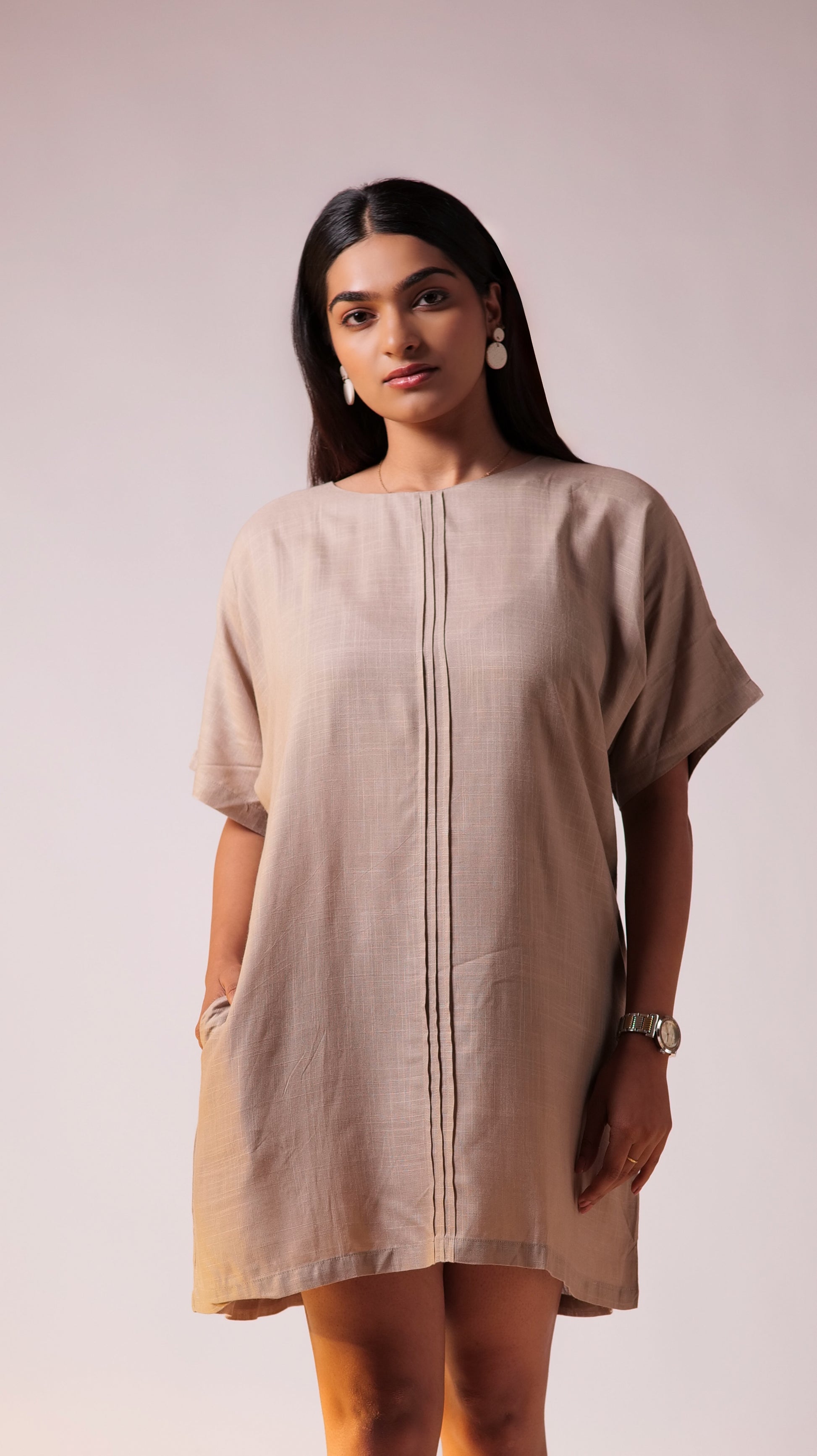 - The dress has clean lines and a simple design, giving it a modern, minimalist appeal. The subtle vertical seam detailing adds texture and dimension.