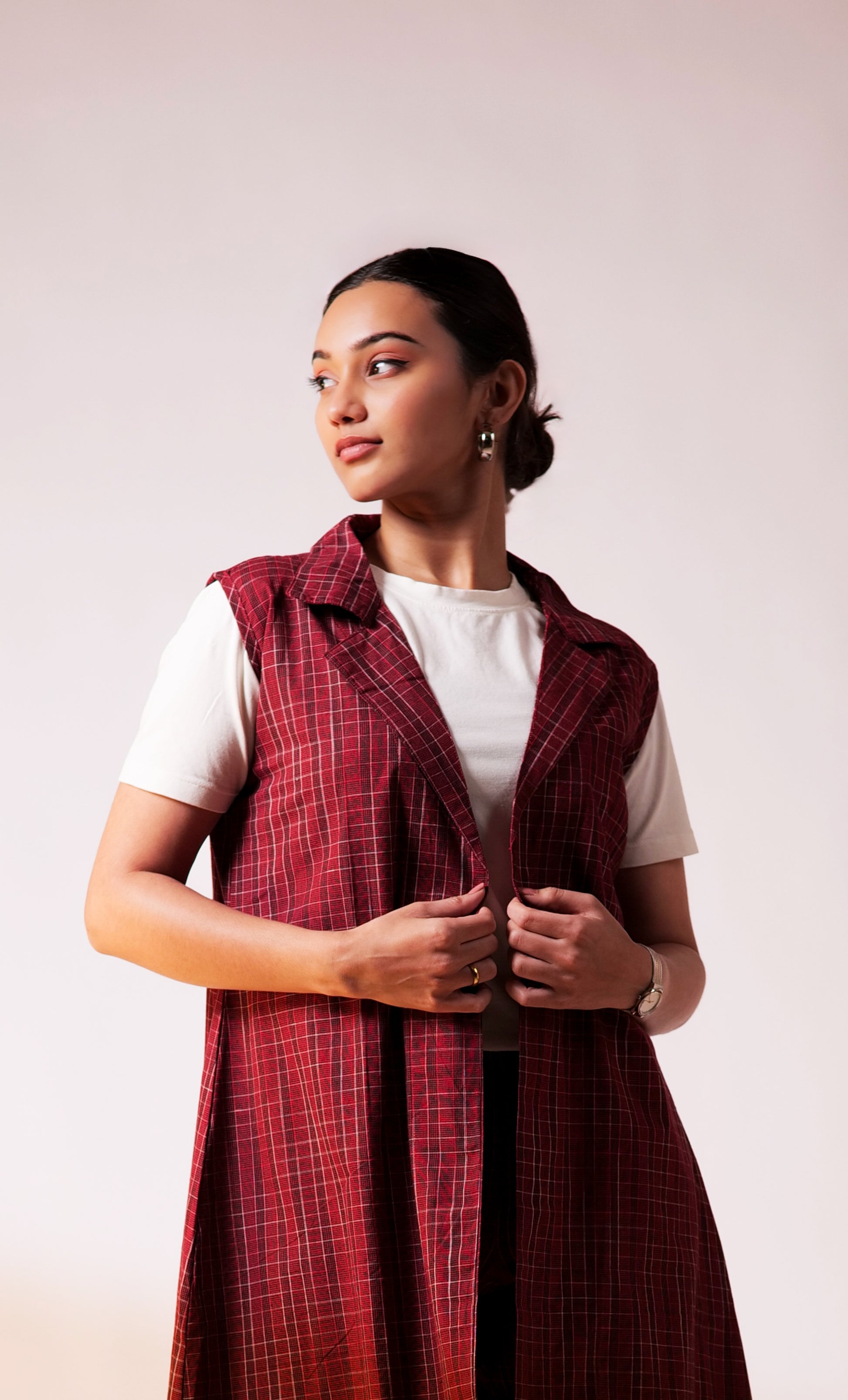 - A sleeveless, open-front longline blazer adds a modern, structured touch while keeping it breathable.