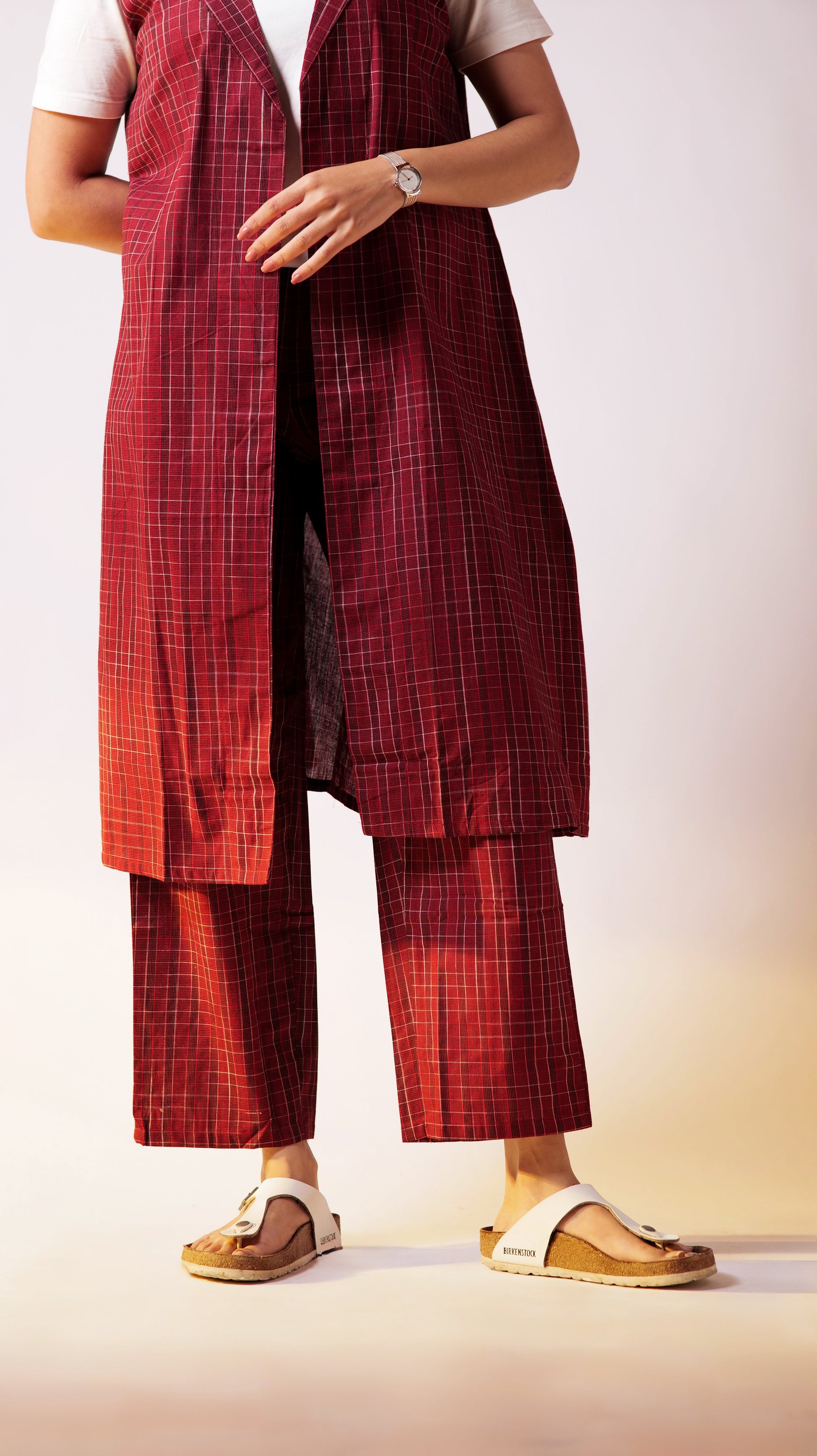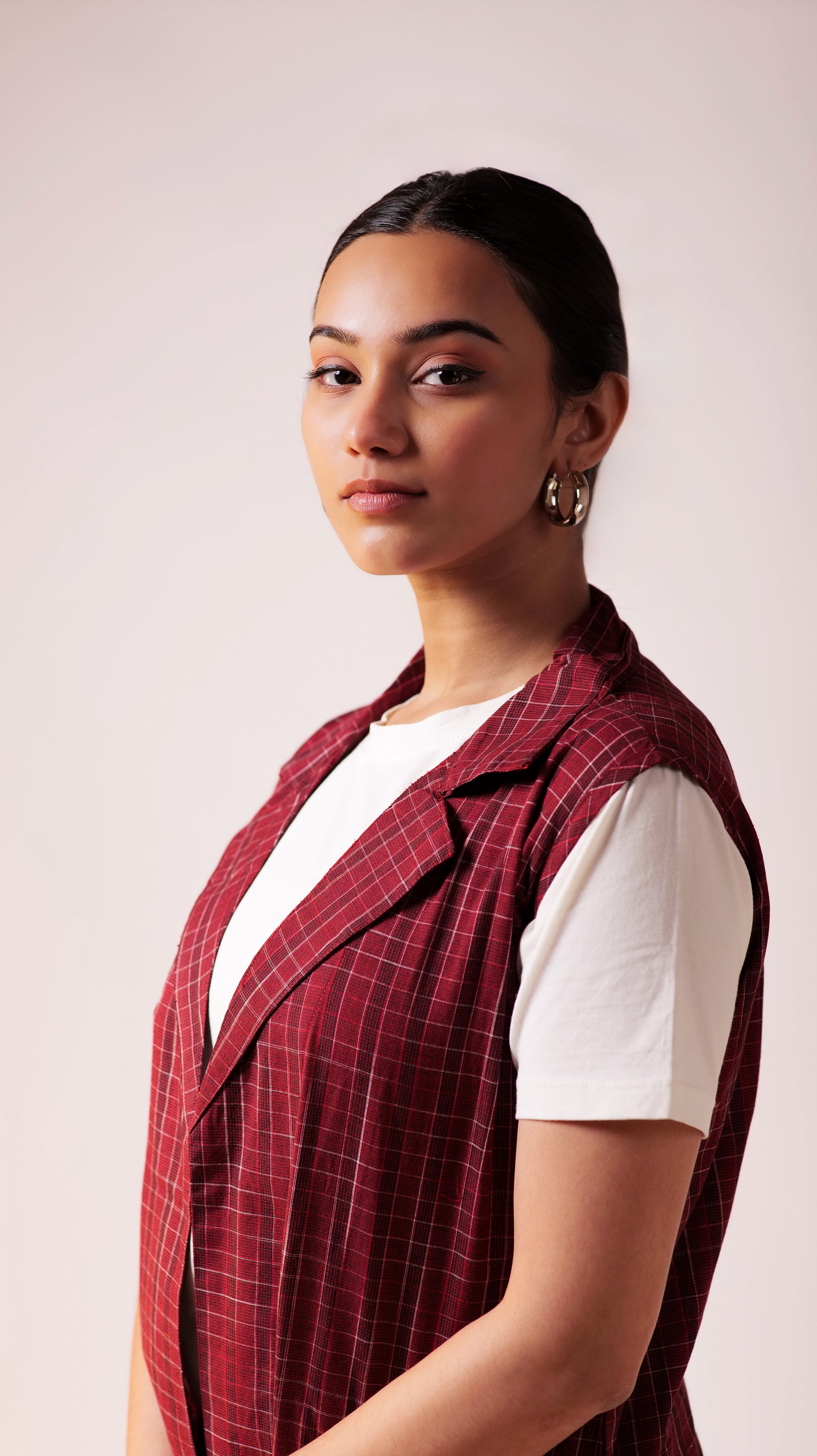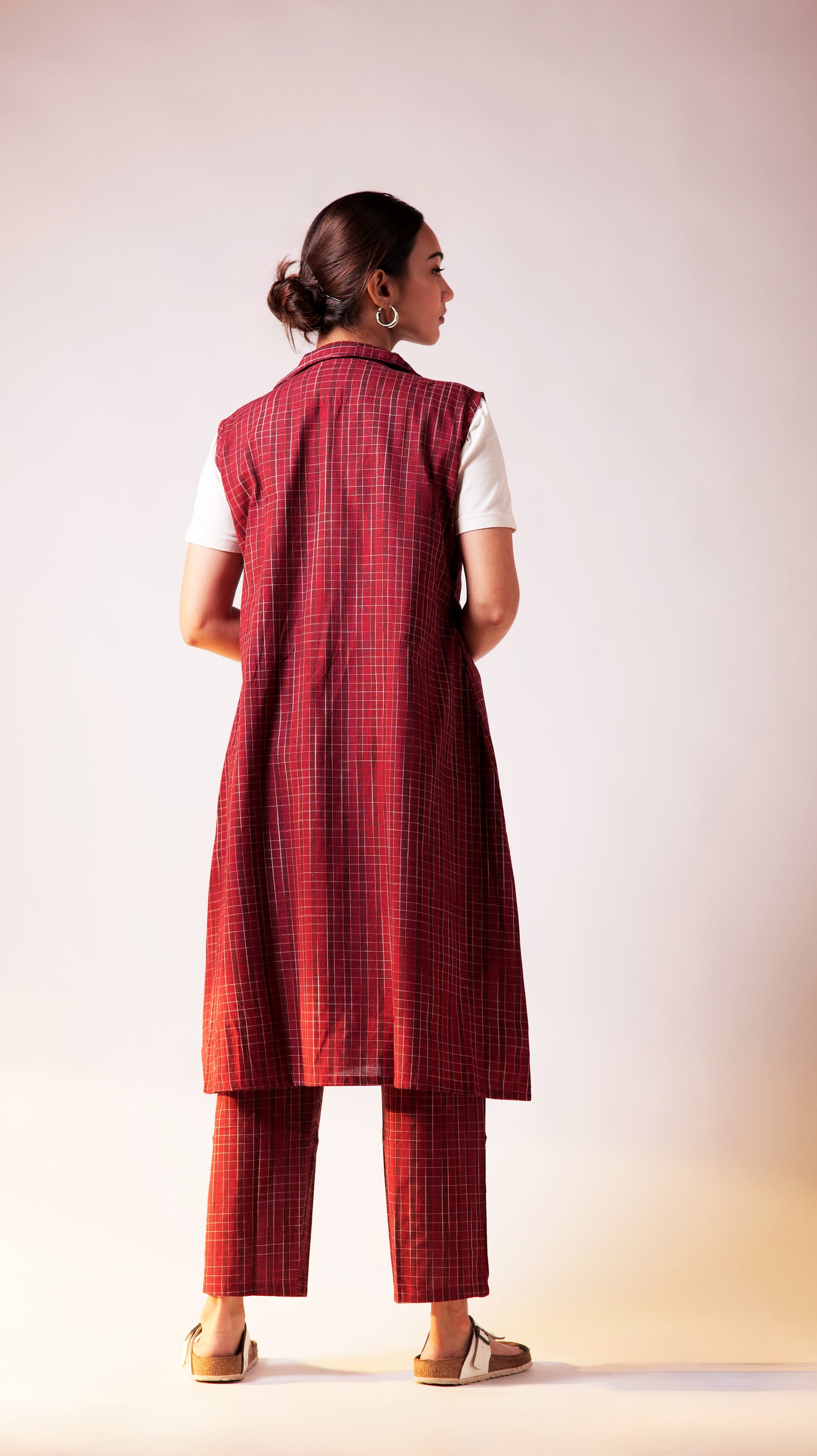- Coordinated deep red tones with a subtle quad pattern bring depth and cohesion to the look.