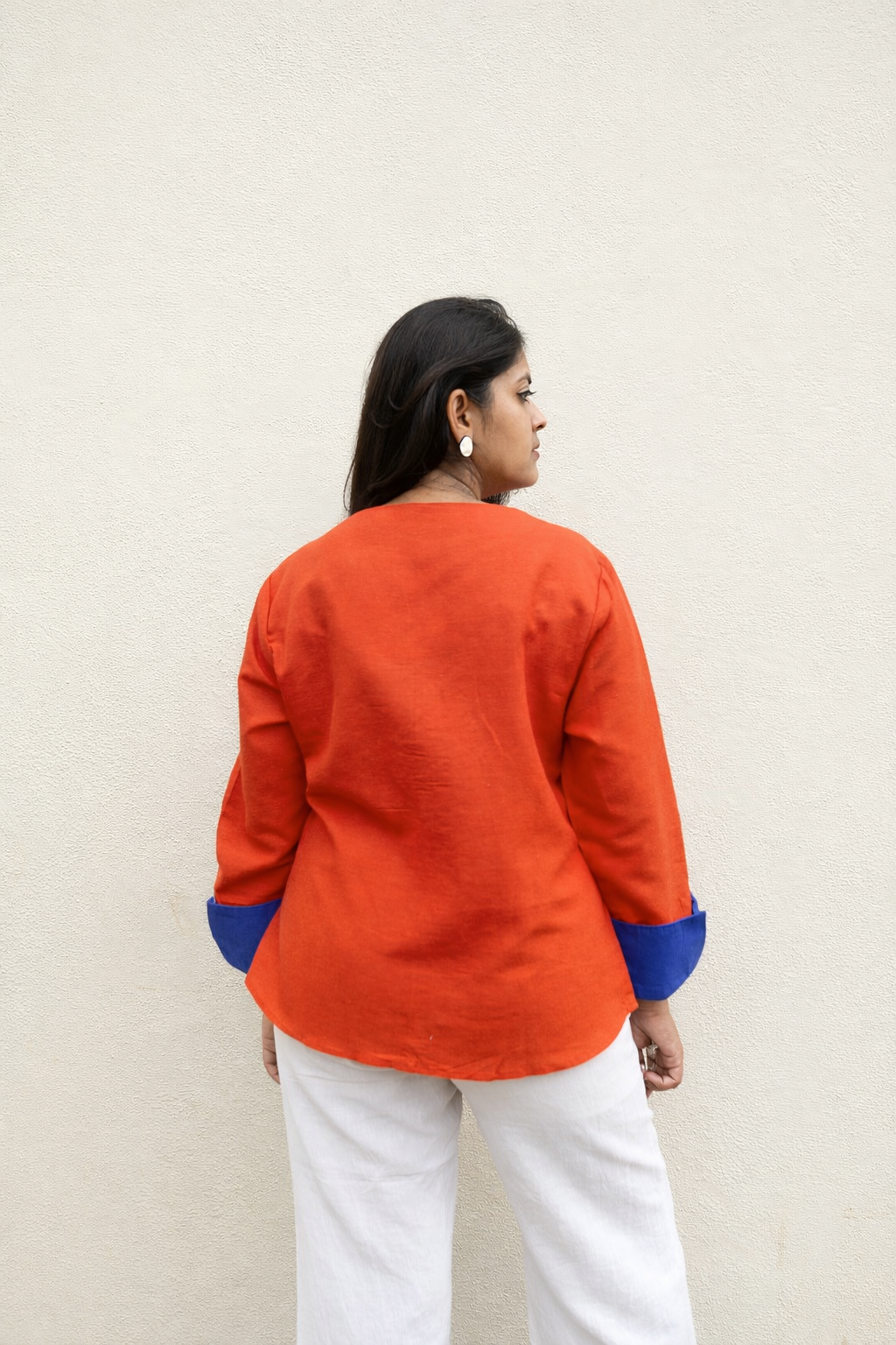 - A bright orange red shirt balanced with contrasting candy-pink cuffs for a chic two-tone effect.