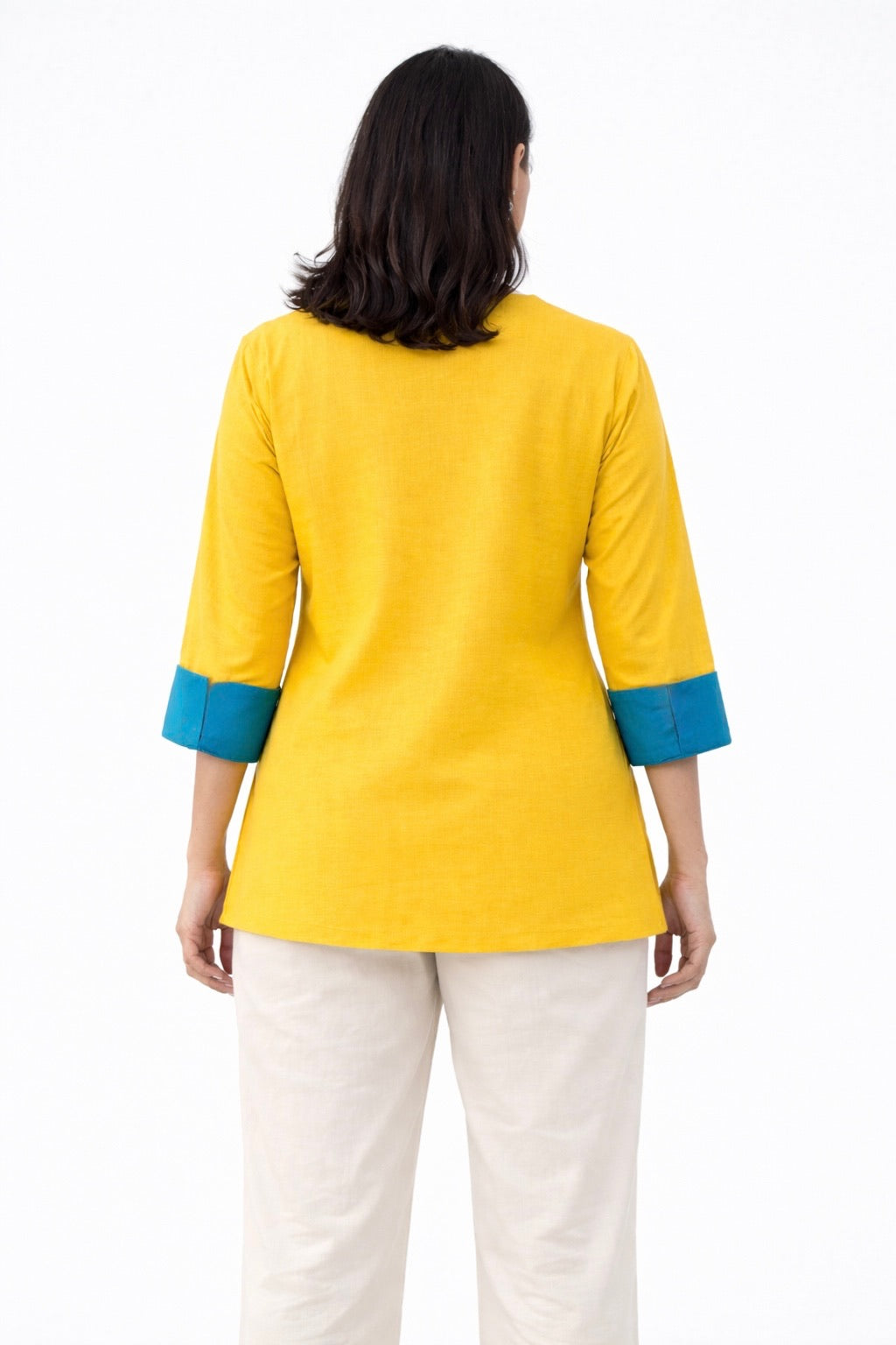 - An Summer yellow shirt contrasted with sky blue cuffs for a playful color block finish.