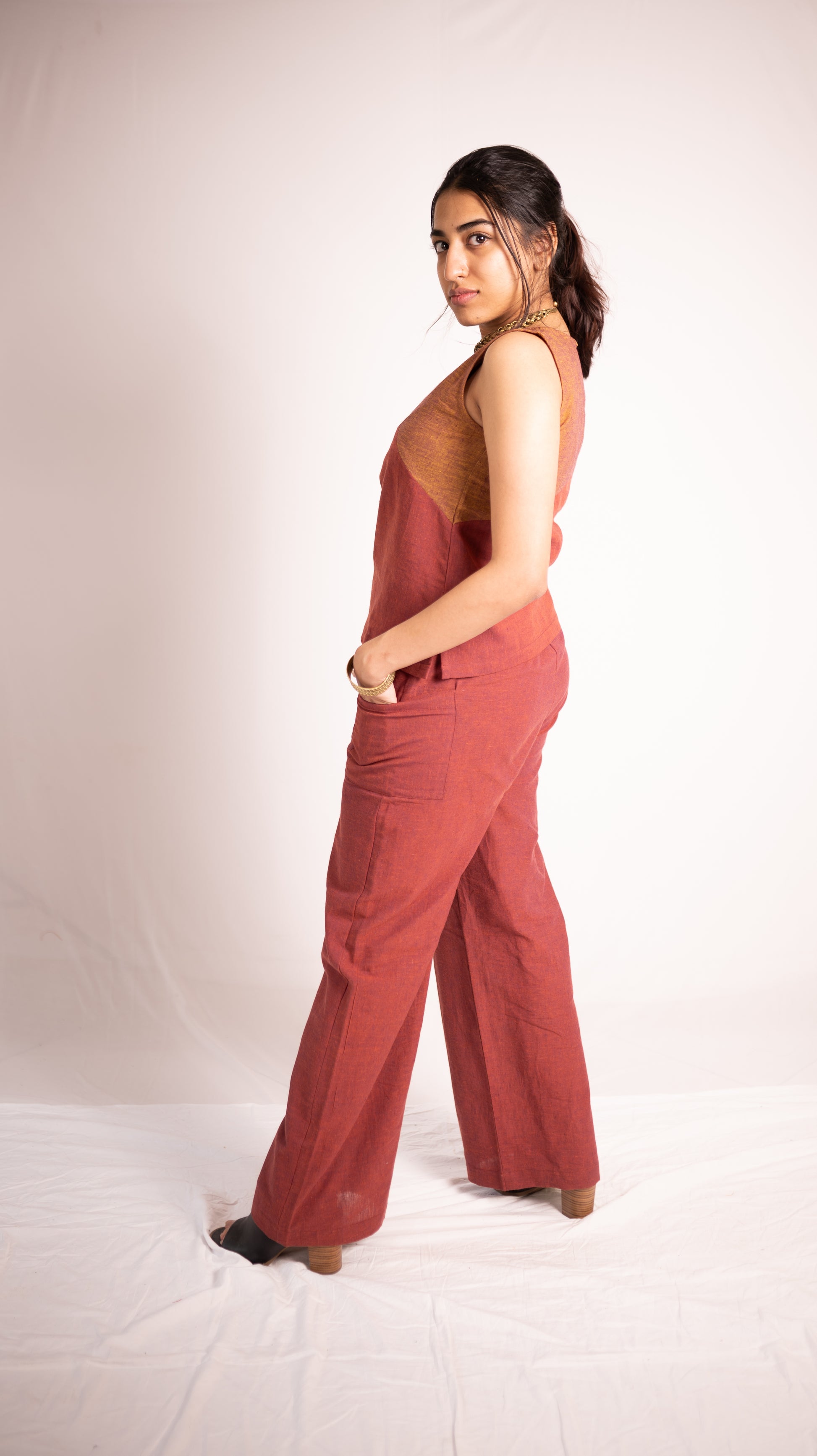 - This outfit features a bold, geometric, colour-blocked design in earthy tones of orange and bold rust. The striking yet understated palette adds a contemporary twist to a classic silhouette.