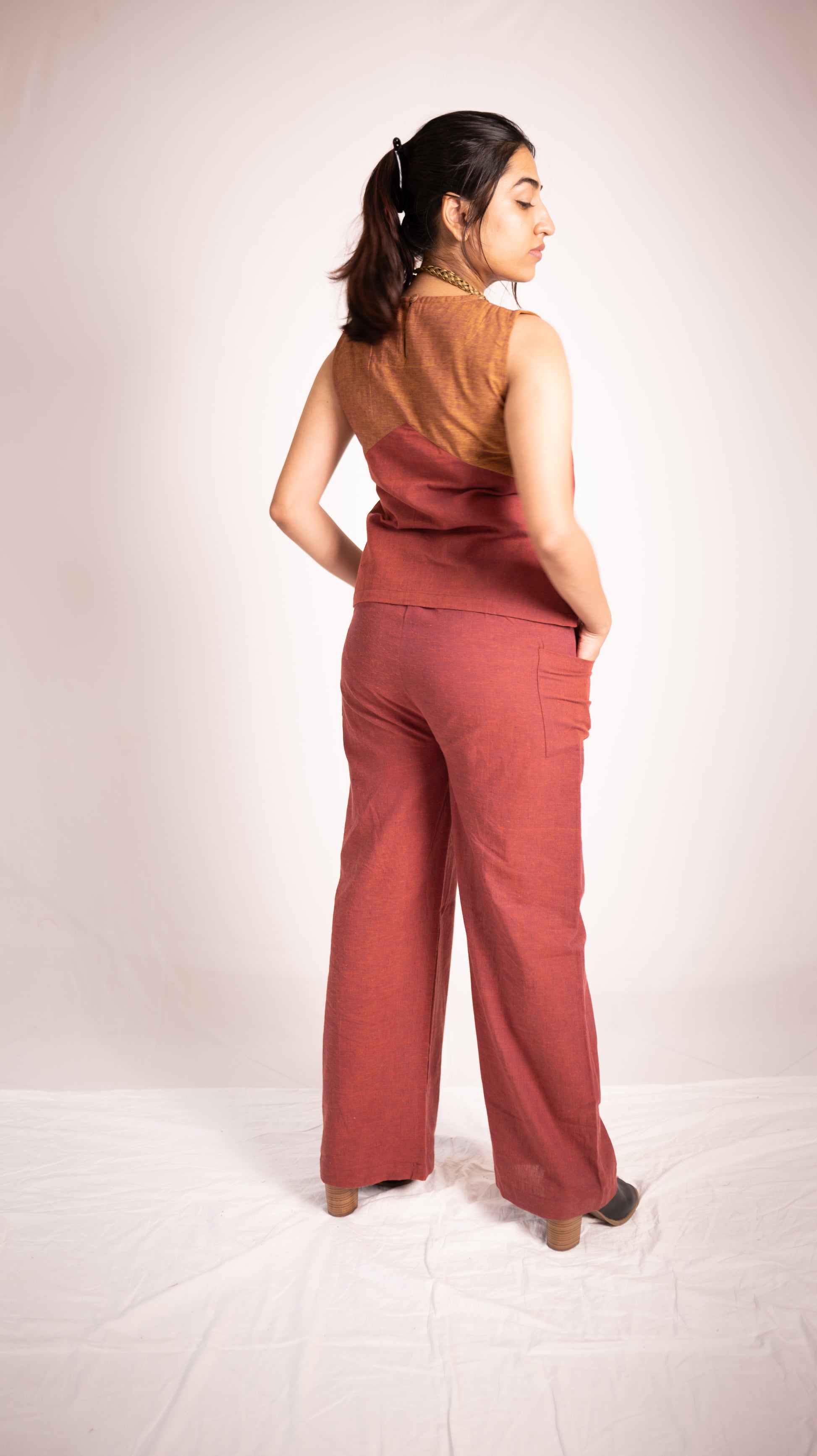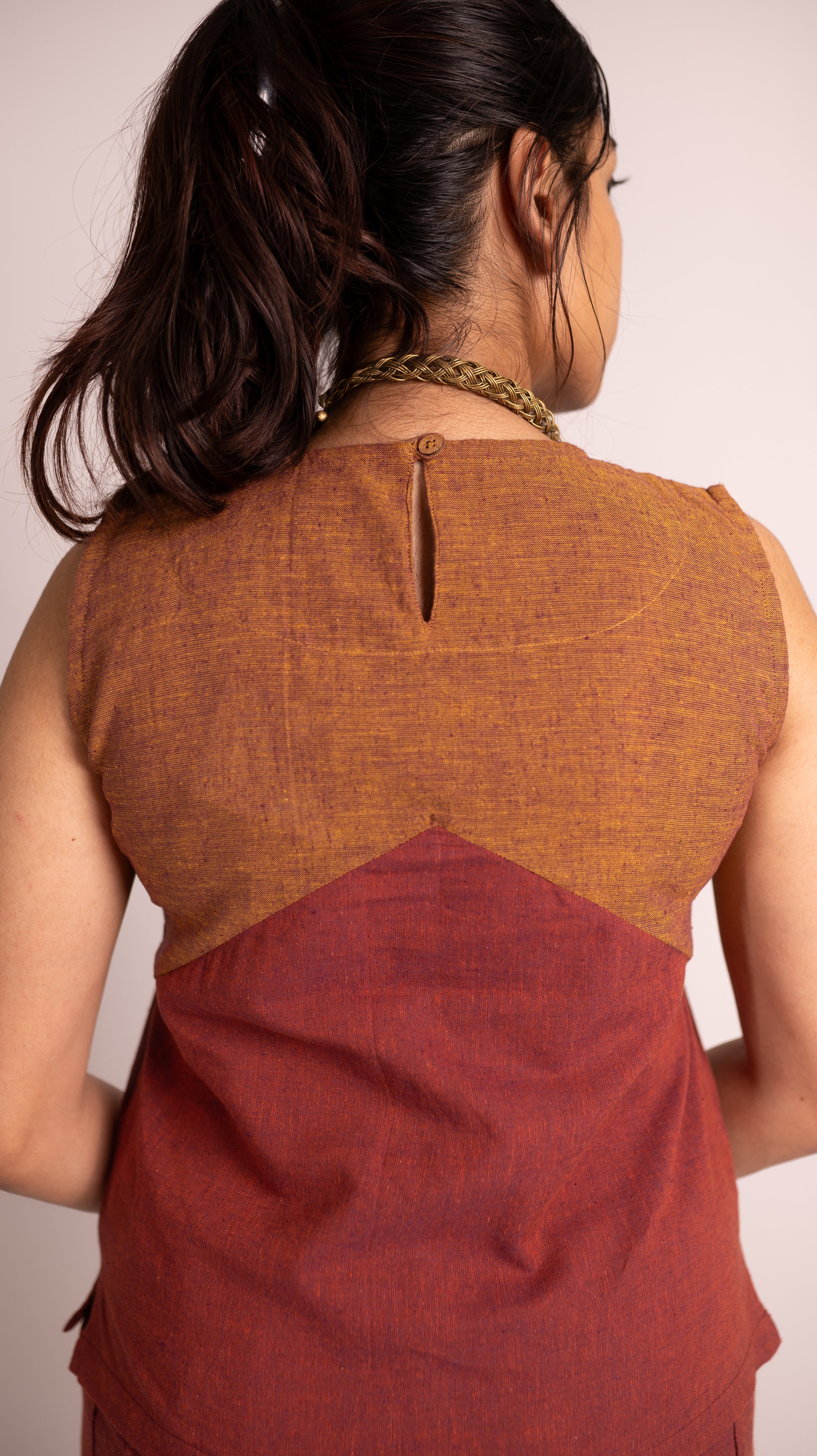 - The sleeveless top showcases a high round neckline, lending a clean and structured look. It includes a subtle back closure with a loop button for easy wear, while the relaxed fit ensures freedom of movement without compromising style.