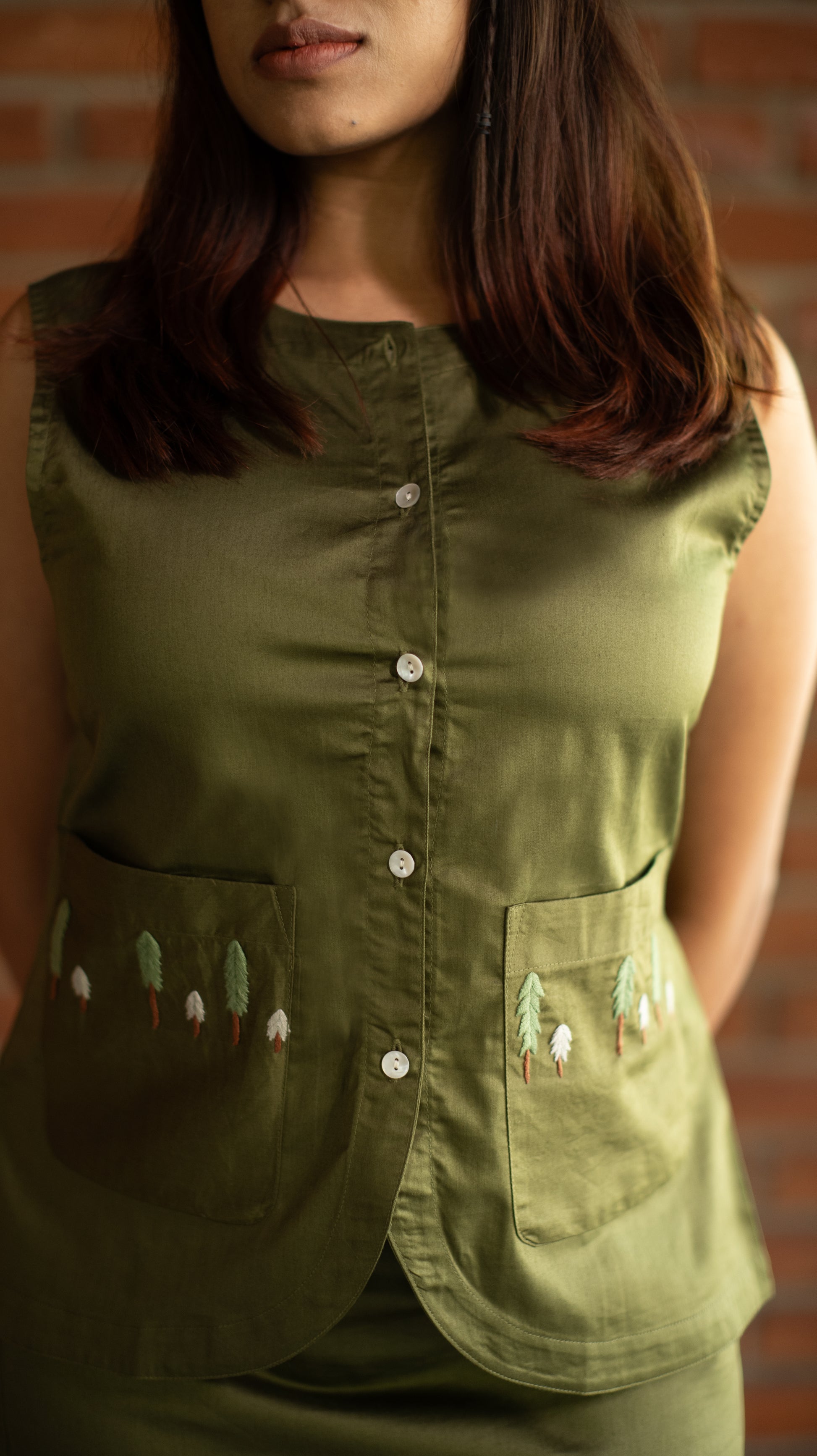 - The vest features subtle, tree embroidery on the pockets, adding a touch of artisanal charm inspired from the elements of nature.