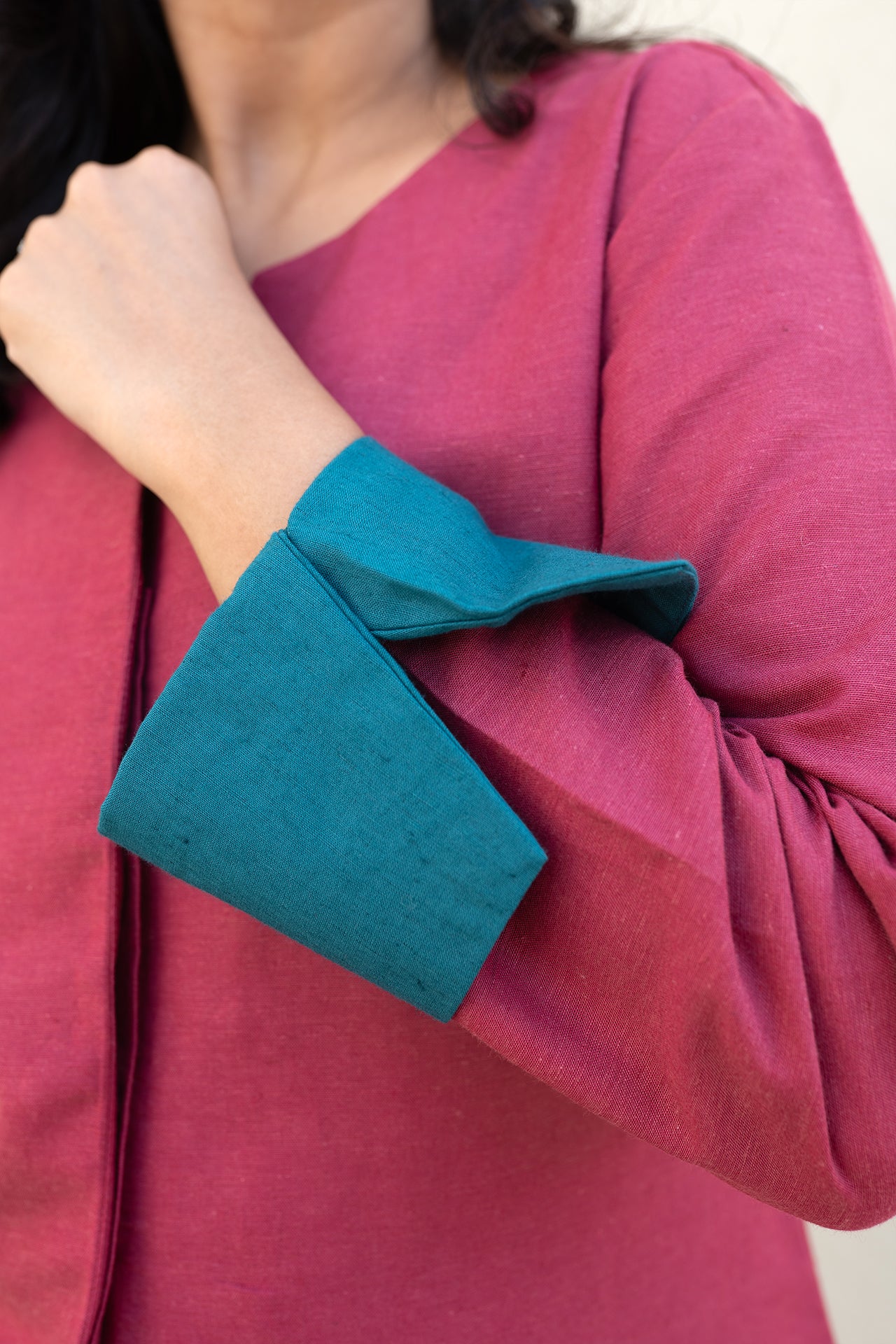 - A rich vintage pink shirt accented with deep teal contrast cuffs for a striking pop of color.