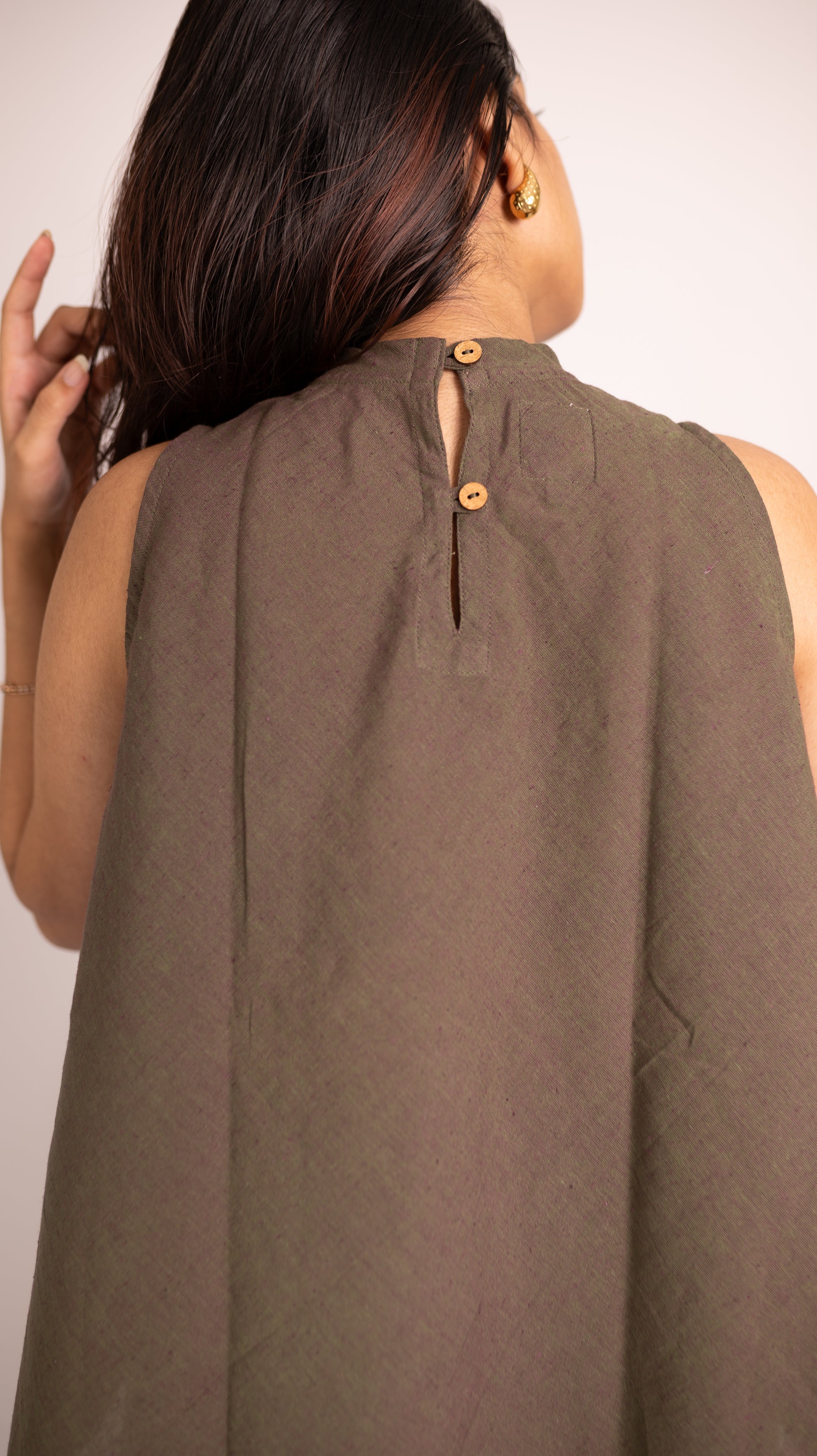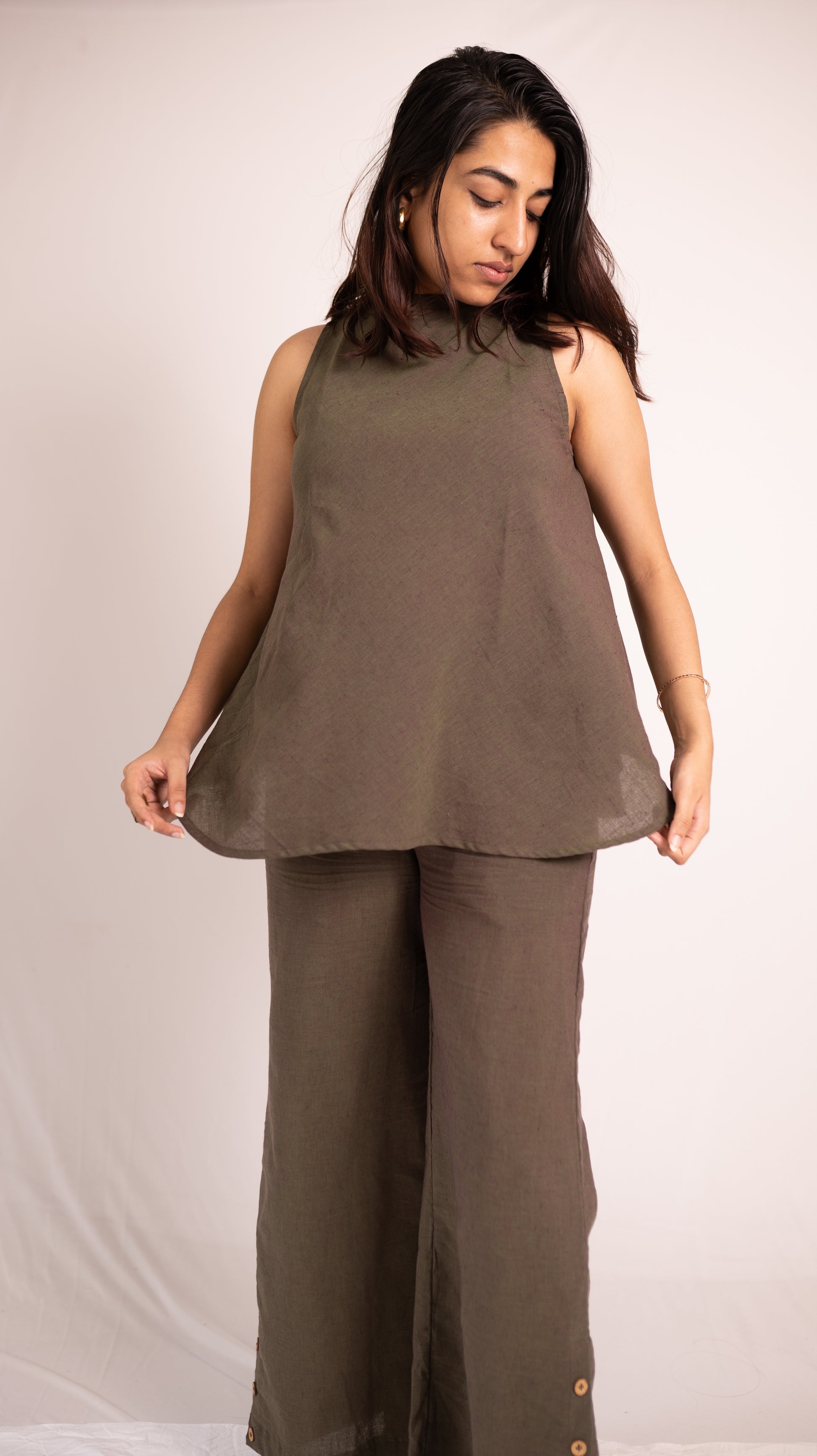 - This stylish set features a sleeveless A-line top with a relaxed fit and a high, structured neckline for a clean and modern look.