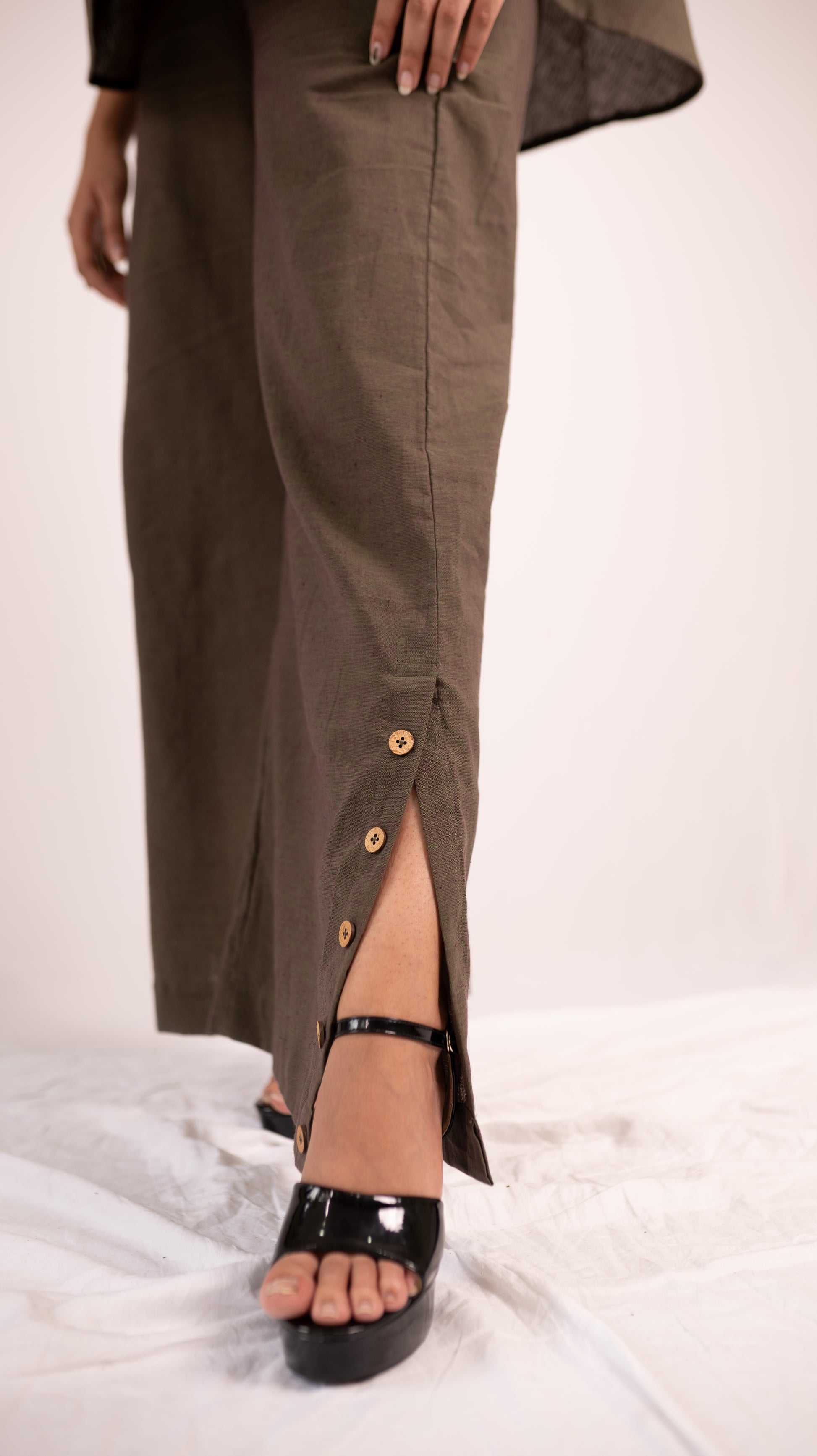- Paired with flair pants, the ensemble exudes effortless elegance. The pants feature a unique slit detail that can be buttoned up, allowing for versatile styling and a touch of personalised flair.